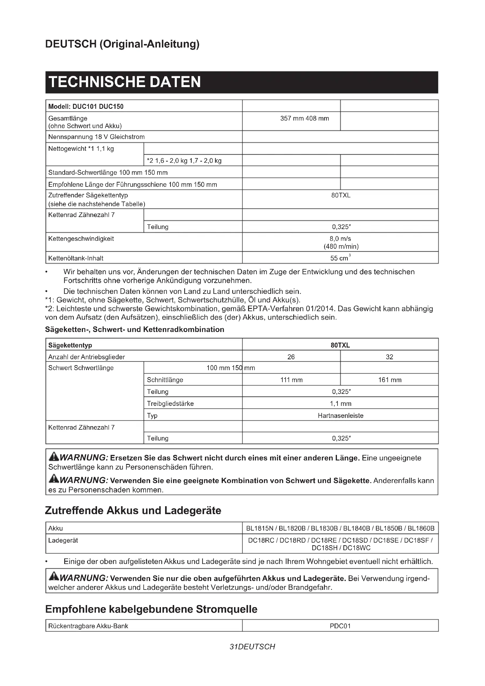 - Batterie et chargeur de marque Makita NOTE : Il se peut que certains éléments de la liste soient compris dans l’emballage de l’outil en tant qu’accessoires standard. Ils peuvent varier d’un pays àl’autre.31 DEUTSCH DEUTSCH (Original-Anleitung) TECHNISCHE DATEN Modell: DUC101 DUC150 Gesamtlänge (ohne Schwert und Akku) 357 mm 408 mm Nennspannung 18 V Gleichstrom Nettogewicht *1 1,1 kg *2 1,6 - 2,0 kg 1,7 - 2,0 kg Standard-Schwertlänge 100 mm 150 mm Empfohlene Länge der Führungsschiene 100 mm 150 mm ZutreenderSägekettentyp (siehe die nachstehende Tabelle) 80TXL Kettenrad Zähnezahl 7 Teilung 0,325″ Kettengeschwindigkeit 8,0 m/s (480 m/min) Kettenöltank-Inhalt 55 cm