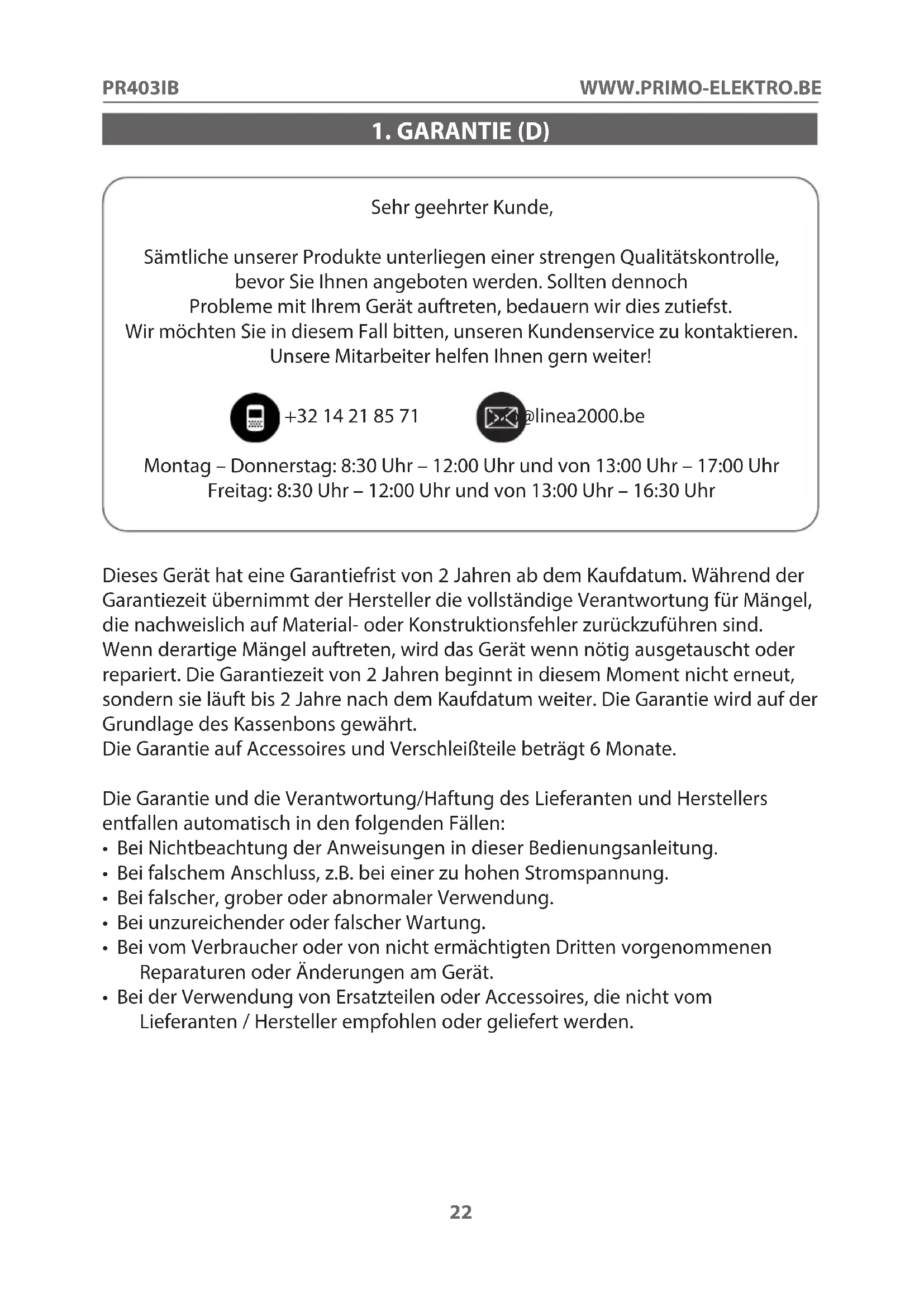 Sehr geehrter Kunde, Sämtliche unserer Produkte unterliegen einer strengen Qualitätskontrolle, bevor Sie Ihnen angeboten werden. Sollten dennoch Probleme mit Ihrem Gerät auftreten, bedauern wir dies zutiefst. Wir möchten Sie in diesem Fall bitten, unseren Kundenservice zu kontaktieren. Unsere Mitarbeiter helfen Ihnen gern weiter! +32 14 21 85 71 info@linea2000.be Montag – Donnerstag: 8:30 Uhr – 12:00 Uhr und von 13:00 Uhr – 17:00 Uhr Freitag: 8:30 Uhr – 12:00 Uhr und von 13:00 Uhr – 16:30 Uhr Dieses Gerät hat eine Garantiefrist von 2 Jahren ab dem Kaufdatum. Während der Garantiezeit übernimmt der Hersteller die vollständige Verantwortung für Mängel, die nachweislich auf Material- oder Konstruktionsfehler zurückzuführen sind. Wenn derartige Mängel auftreten, wird das Gerät wenn nötig ausgetauscht oder repariert. Die Garantiezeit von 2 Jahren beginnt in diesem Moment nicht erneut, sondern sie läuft bis 2 Jahre nach dem Kaufdatum weiter. Die Garantie wird auf der Grundlage des Kassenbons gewährt. Die Garantie auf Accessoires und Verschleißteile beträgt 6 Monate. Die Garantie und die Verantwortung/Haftung des Lieferanten und Herstellers entfallen automatisch in den folgenden Fällen: