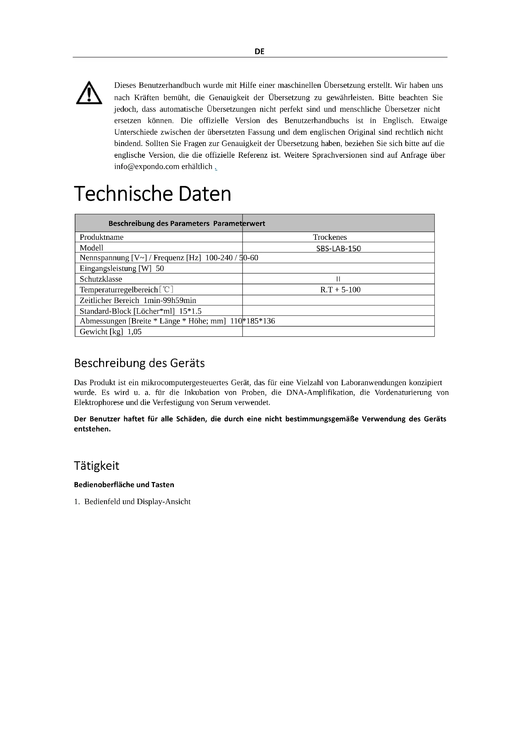 USER MANUAL Bedienungsanleitung Instrukcja obsługi Návod k použití Manuel d´utilisation Istruzioni per l‘uso Manual de instrucciones Használati útmutató Brugsanvisning Käyttöohje Gebruiksaanwijzing Bruksanvisning Instruções de utilização Používateľská príručka Ръководство за употреба Οδηγιεσ χρησησ Upute za uporabu Naudojimo instrukcija Manual de utilizare Navodila za uporabo expondo.com DRY BATHDE Produktname Trockenbad EN Product name Dry Bath PL Nazwa produktu Urządzenie do suchej kąpieli CZ Název výrobku Suchá lázeň FR Nom du produit Bain sec IT Nome del prodotto Bagno a secco ES Nombre del producto Baño seco HU Termék neve Száraz fürdő DA Produktnavn Tørt bad FI Tuotteen nimi Kuiva kylpy NL Productnaam Droog bad NO Produktnavn Tørrbad SE Produktnamn Torrbad PT Nome do produto Banho Seco SK Názov produktu Suchý kúpeľ BG Име на продукта Суха баня EL Όνομα προϊόντος Ξηρό λουτρό HR Naziv proizvoda Suha kupka LT Produkto pavadinimas Sausa vonia RO Numele produsului Baie uscată SL Ime izdelka Suha kopel DE Modell | EN Product model | PL Model produktu | CZ Model výrobku | FR Modèle | IT Modello | ES Modelo | HU Modell | DA Model | FI Tuotteen malli | NL Productmodel | NO Produktmodell | SE Produktmodell | PT Modelo do produto | SK Model | BG Модел на продукт | EL Μοντέλο προϊόντος | HR Model proizvoda | LT: Gaminio modelis | RO: Model de produs | SL: Model izdelka SBS-LAB-150 DE Hersteller | EN Manufacturer | PL Producent | CZ Výrobce | FR Fabricant | IT Produttore | ES Fabricante | HU Termelő | DA Producent | FI Valmistaja | NL Producent | NO Produsent | SE Tillverkare | PT Fabricante | SK Výrobca | BG Производител | EL Κατασκευαστής | HR Proizvođač | LT Gamintojas | RO Producător | SL Proizvajalec expondo Polska sp. z o.o. sp. k. DE Anschrift des Herstellers | EN Manufacturer Address | PL Adres producenta | CZ Adresa výrobce | FR Adresse du fabricant | IT Indirizzo del produttore | ES Dirección del fabricante | HU A gyártó címe | DA Producentens adresse | FI Valmistajan osoite | NL Adres producent | NO Produsentens adresse | SE Tillverkarens adress | PT Endereço do fabricante | SK Adresa výrobcu | BG Адрес на производителя | EL: Διεύθυνση κατασκευαστή | HR Adresa proizvođača | LT Gamintojo adresas | RO Adresa producătorului | SL Naslov proizvajalca ul. Nowy Kisielin – Innowacyjna 7, 66-002 Zielona Góra | Poland, EUDE Dieses Benutzerhandbuch wurde mit Hilfe einer maschinellen Übersetzung erstellt. Wir haben uns nach Kräften bemüht, die Genauigkeit der Übersetzung zu gewährleisten. Bitte beachten Sie jedoch, dass automatische Übersetzungen nicht perfekt sind und menschliche Übersetzer nicht ersetzen können. Die offizielle Version des Benutzerhandbuchs ist in Englisch. Etwaige Unterschiede zwischen der übersetzten Fassung und dem englischen Original sind rechtlich nicht bindend. Sollten Sie Fragen zur Genauigkeit der Übersetzung haben, beziehen Sie sich bitte auf die englische Version, die die offizielle Referenz ist. Weitere Sprachversionen sind auf Anfrage über info@expondo.com erhältlich . Technische Daten Beschreibung des Parameters Parameterwert Produktname Trockenes Bad Modell Nennspannung [V~] / Frequenz [Hz] 100-240 / 50-60 Eingangsleistung [W] 50 Schutzklasse Temperaturregelbereich[℃] R.T + 5-100 Zeitlicher Bereich 1min-99h59min Standard-Block [Löcher*ml] 15*1.5 Abmessungen [Breite * Länge * Höhe; mm] 110*185*136 Gewicht [kg] 1,05 Beschreibung des Geräts Das Produkt ist ein mikrocomputergesteuertes Gerät, das für eine Vielzahl von Laboranwendungen konzipiert wurde. Es wird u. a. für die Inkubation von Proben, die DNA-Amplifikation, die Vordenaturierung von Elektrophorese und die Verfestigung von Serum verwendet. Der Benutzer haftet für alle Schäden, die durch eine nicht bestimmungsgemäße Verwendung des Geräts entstehen. Tätigkeit Bedienoberfläche und Tasten