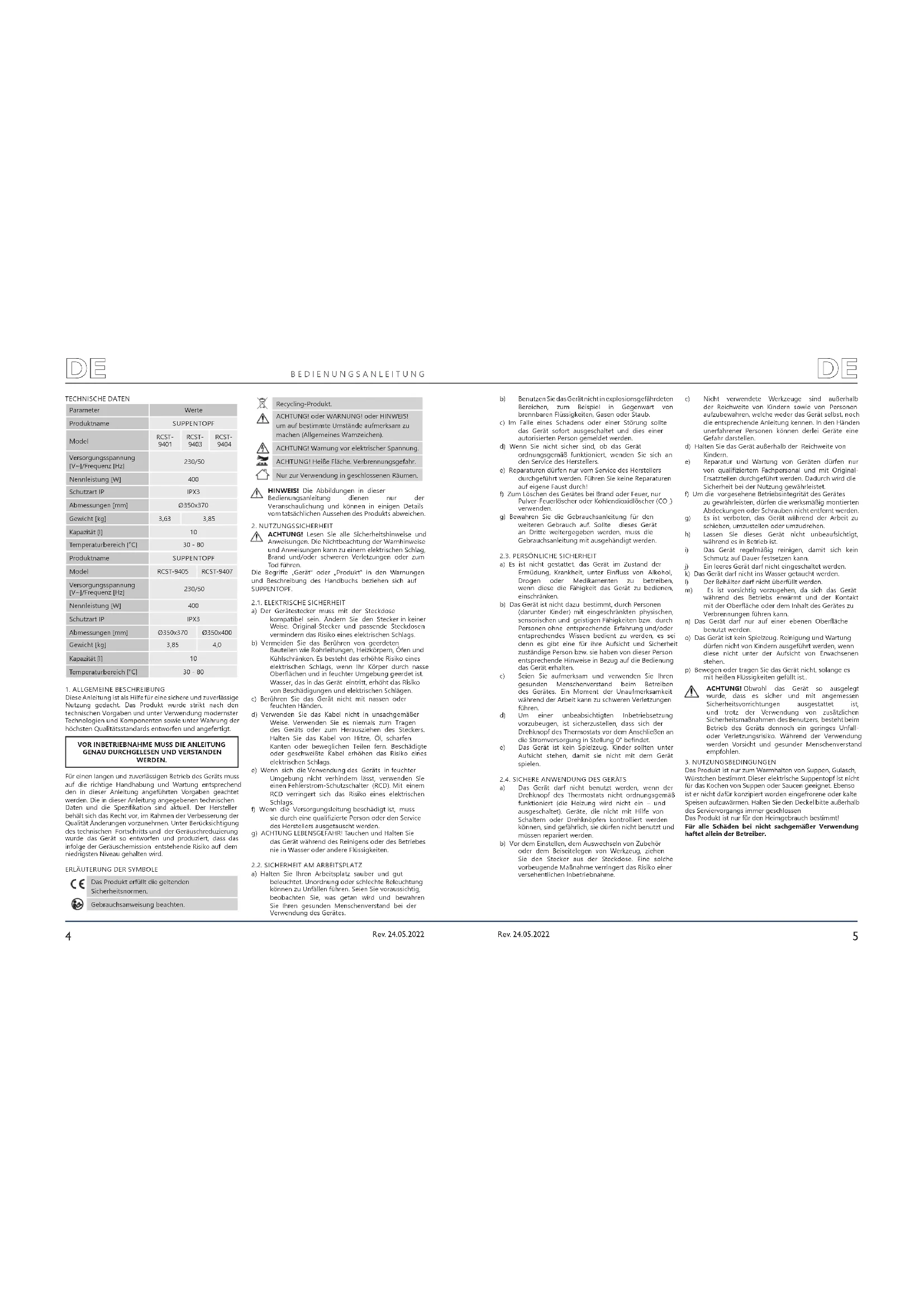 Schmutz auf Dauer festsetzen kann. j) Ein leeres Gerät darf nicht eingeschaltet werden. k) Das Gerät darf nicht ins Wasser getaucht werden. l) Der Behälter darf nicht überfüllt werden. m) Es ist vorsichtig vorzugehen, da sich das Gerät während des Betriebs erwärmt und der Kontakt mit der Oberäche oder dem Inhalt des Gerätes zu Verbrennungen führen kann. n) Das Gerät darf nur auf einer ebenen Oberäche benutzt werden. o) Das Gerät ist kein Spielzeug. Reinigung und Wartung dürfen nicht von Kindern ausgeführt werden, wenn diese nicht unter der Aufsicht von Erwachsenen stehen. p) Bewegen oder tragen Sie das Gerät nicht, solange es mit heißen Flüssigkeiten gefüllt ist.. Produktname SUPPENTOPF Model RCST-9405 RCST-9407 Versorgungsspannung [V~]/Frequenz [Hz] 230/50 Nennleistung [W] 400 Schutzart IP IPX3 Abmessungen [mm] Ø350x370 Ø350x400 Gewicht [kg] 3,85 4,0 Kapazität [l] 10 Temperaturbereich [°C] 30 - 80 Das Produkt erfüllt die geltenden Sicherheitsnormen. Gebrauchsanweisung beachten. ACHTUNG! Obwohl das Gerät so ausgelegt wurde, dass es sicher und mit angemessen Sicherheitsvorrichtungen ausgestattet ist, und trotz der Verwendung von zusätzlichen Sicherheitsmaßnahmen des Benutzers, besteht beim Betrieb des Geräts dennoch ein geringes Unfall- oder Verletzungsrisiko. Während der Verwendung werden Vorsicht und gesunder Menschenverstand empfohlen.