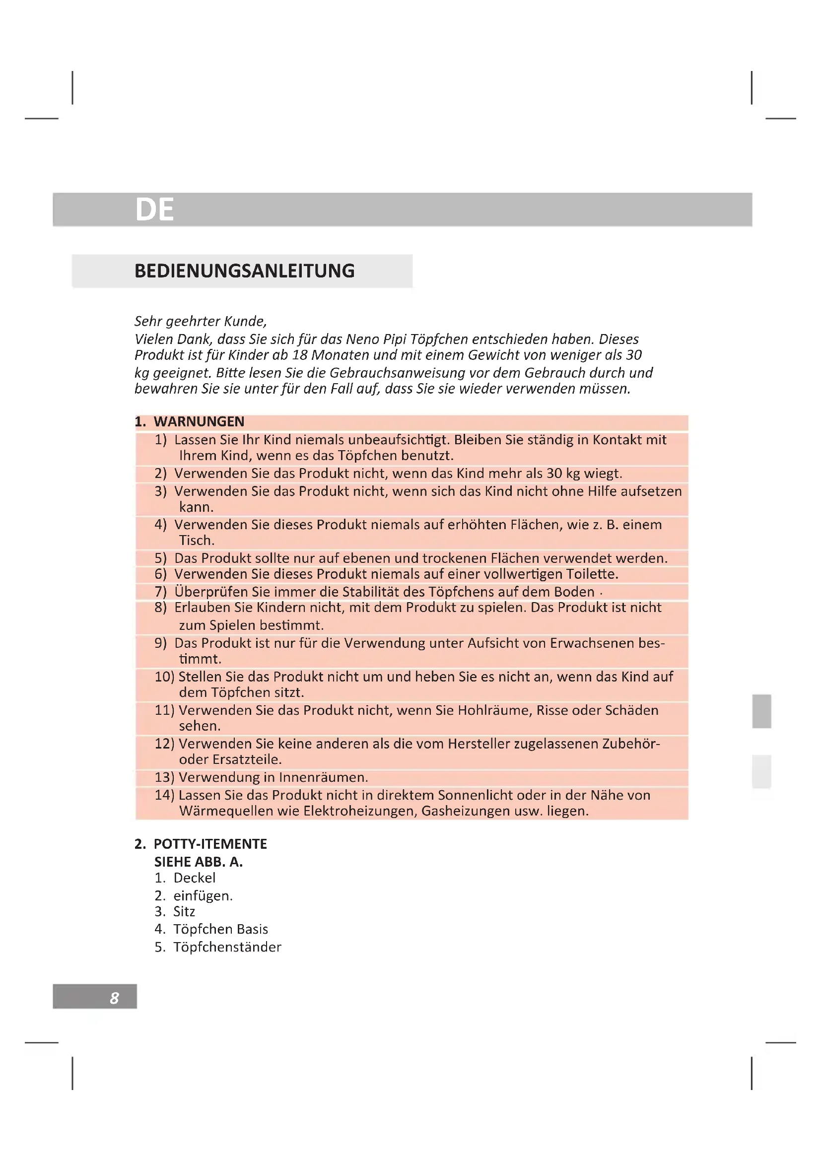 BEDIENUNGSANLEITUNG Sehr geehrter Kunde, Vielen Dank, dass Sie sich für das Neno Pipi Töpfchen entschieden haben. Dieses Produkt ist für Kinder ab 18 Monaten und mit einem Gewicht von weniger als 30 kg geeignet. Bie lesen Sie die Gebrauchsanweisung vor dem Gebrauch durch und bewahren Sie sie unter für den Fall auf, dass Sie sie wieder verwenden müssen.