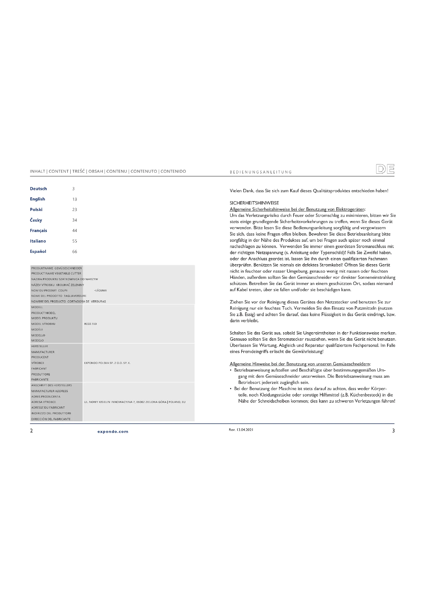 Deutsch English Polski Česky Français Italiano Español INHALT | CONTENT | TREŚĆ | OBSAH | CONTENU | CONTENUTO | CONTENIDO expondo.com PRODUKTNAME GEMÜSESCHNEIDERPRODUCT NAME VEGETABLE CUTTERNAZWA PRODUKTU SZATKOWNICA DO WARZYWNÁZEV VÝROBKU KROUHAČ ZELENINYNOM DU PRODUIT COUPE LÉGUMENOME DEL PRODOTTO TAGLIAVERDURENOMBRE DEL PRODUCTO CORTADORA DE VERDURASMODELLRCGS 550PRODUCT MODELMODEL PRODUKTUMODEL VÝROBKUMODÈLEMODELLOMODELOHERSTELLEREXPONDO POLSKA SP. Z O.O. SP. K.MANUFACTURERPRODUCENTVÝROBCEFABRICANTPRODUTTOREFABRICANTEANSCHRIFT DES HERSTELLERSUL. NOWY KISIELIN INNOWACYJNA 7, 66 002 ZIELONA GÓRA | POLAND, EUMANUFACTURER ADDRESSADRES PRODUCENTAADRESA VÝROBCEADRESSE DU FABRICANTINDIRIZZO DEL PRODUTTOREDIRECCIÓN DEL FABRICANTE Vielen Dank, dass Sie sich zum Kauf dieses Qualitätsproduktes entschieden haben! SICHERHEITSHINWEISE Allgemeine Sicherheitshinweise bei der Benutzung von Elektrogeräten: Um das Verletzungsrisiko durch Feuer oder Stromschlag zu minimieren, bitten wir Sie stets einige grundlegende Sicherheitsvorkehrungen zu treffen, wenn Sie dieses Gerät verwenden. Bitte lesen Sie diese Bedienungsanleitung sorgfältig und vergewissern Sie sich, dass keine Fragen offen bleiben. Bewahren Sie diese Betriebsanleitung bitte sorgfältig in der Nähe des Produktes auf, um bei Fragen auch später noch einmal nachschlagen zu können. Verwenden Sie immer einen geerdeten Stromanschluss mit der richtigen Netzspannung (s. Anleitung oder Typenschild)! Falls Sie Zweifel haben, oder der Anschluss geerdet ist, lassen Sie ihn durch einen qualizierten Fachmann überprüfen. Benützen Sie niemals ein defektes Stromkabel! Öffnen Sie dieses Gerät nicht in feuchter oder nasser Umgebung, genauso wenig mit nassen oder feuchten Händen, außerdem sollten Sie den Gemüseschneider vor direkter Sonneneinstrahlung schützen. Betreiben Sie das Gerät immer an einem geschützten Ort, sodass niemand auf Kabel treten, über sie fallen und/oder sie beschädigen kann. Ziehen Sie vor der Reinigung dieses Gerätes den Netzstecker und benutzen Sie zur Reinigung nur ein feuchtes Tuch. Vermeiden Sie den Einsatz von Putzmitteln (nutzen Sie z.B. Essig) und achten Sie darauf, dass keine Flüssigkeit in das Gerät eindringt, bzw. darin verbleibt. Schalten Sie das Gerät aus, sobald Sie Ungereimtheiten in der Funktionsweise merken. Genauso sollten Sie den Stromstecker rausziehen, wenn Sie das Gerät nicht benutzen. Überlassen Sie Wartung, Abgleich und Reparatur qualiziertem Fachpersonal. Im Falle eines Fremdeingriffs erlischt die Gewährleistung! Allgemeine Hinweise bei der Benutzung von unseren Gemüseschneidern: