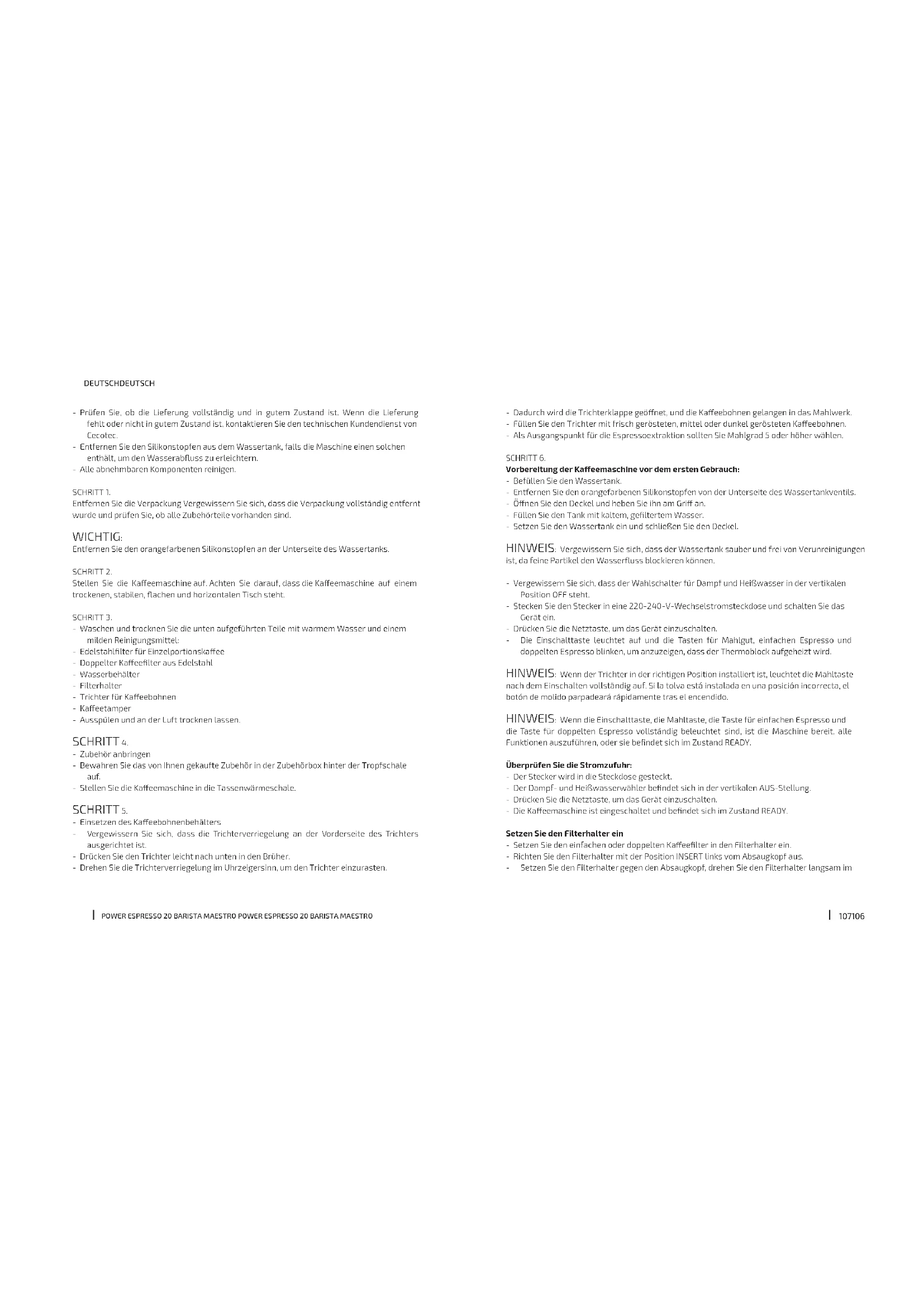 DEUTSCH DEUTSCH - Dadurch wird die Trichterklappe geönet, und die Kaeebohnen gelangen in das Mahlwerk. - Füllen Sie den Trichter mit frisch gerösteten, mittel oder dunkel gerösteten Kaeebohnen. - Als Ausgangspunkt für die Espressoextraktion sollten Sie Mahlgrad 5 oder höher wählen. SCHRITT 6. Vorbereitung der Kaeemaschine vor dem ersten Gebrauch: - Befüllen Sie den Wassertank. - Entfernen Sie den orangefarbenen Silikonstopfen von der Unterseite des Wassertankventils. - Önen Sie den Deckel und heben Sie ihn am Gri an. - Füllen Sie den Tank mit kaltem, geltertem Wasser. - Setzen Sie den Wassertank ein und schließen Sie den Deckel. HINWEIS: Vergewissern Sie sich, dass der Wassertank sauber und frei von Verunreinigungen ist, da feine Partikel den Wasseruss blockieren können. - Vergewissern Sie sich, dass der Wahlschalter für Dampf und Heißwasser in der vertikalen Position OFF steht. - Stecken Sie den Stecker in eine 220-240-V-Wechselstromsteckdose und schalten Sie das Gerät ein. - Drücken Sie die Netztaste, um das Gerät einzuschalten. - Die Einschalttaste leuchtet auf und die Tasten für Mahlgut, einfachen Espresso und doppelten Espresso blinken, um anzuzeigen, dass der Thermoblock aufgeheizt wird. HINWEIS: Wenn der Trichter in der richtigen Position installiert ist, leuchtet die Mahltaste nach dem Einschalten vollständig auf. Si la tolva está instalada en una posición incorrecta, el botón de molido parpadeará rápidamente tras el encendido. HINWEIS: Wenn die Einschalttaste, die Mahltaste, die Taste für einfachen Espresso und die Taste für doppelten Espresso vollständig beleuchtet sind, ist die Maschine bereit, alle Funktionen auszuführen, oder sie bendet sich im Zustand READY. Überprüfen Sie die Stromzufuhr: - Der Stecker wird in die Steckdose gesteckt. - Der Dampf- und Heißwasserwähler bendet sich in der vertikalen AUS-Stellung. - Drücken Sie die Netztaste, um das Gerät einzuschalten. - Die Kaeemaschine ist eingeschaltet und bendet sich im Zustand READY. Setzen Sie den Filterhalter ein - Setzen Sie den einfachen oder doppelten Kaeelter in den Filterhalter ein. - Richten Sie den Filterhalter mit der Position INSERT links vom Absaugkopf aus. - Setzen Sie den Filterhalter gegen den Absaugkopf, drehen Sie den Filterhalter langsam im - Prüfen Sie, ob die Lieferung vollständig und in gutem Zustand ist. Wenn die Lieferung fehlt oder nicht in gutem Zustand ist, kontaktieren Sie den technischen Kundendienst von Cecotec. - Entfernen Sie den Silikonstopfen aus dem Wassertank, falls die Maschine einen solchen enthält, um den Wasserabuss zu erleichtern. - Alle abnehmbaren Komponenten reinigen. SCHRITT 1. Entfernen Sie die Verpackung Vergewissern Sie sich, dass die Verpackung vollständig entfernt wurde und prüfen Sie, ob alle Zubehörteile vorhanden sind. WICHTIG: Entfernen Sie den orangefarbenen Silikonstopfen an der Unterseite des Wassertanks. SCHRITT 2. Stellen Sie die Kaeemaschine auf. Achten Sie darauf, dass die Kaeemaschine auf einem trockenen, stabilen, achen und horizontalen Tisch steht. SCHRITT 3. - Waschen und trocknen Sie die unten aufgeführten Teile mit warmem Wasser und einem milden Reinigungsmittel: - Edelstahllter für Einzelportionskaee - Doppelter Kaeelter aus Edelstahl - Wasserbehälter - Filterhalter - Trichter für Kaeebohnen - Kaeetamper - Ausspülen und an der Luft trocknen lassen. SCHRITT 4. - Zubehör anbringen - Bewahren Sie das von Ihnen gekaufte Zubehör in der Zubehörbox hinter der Tropfschale auf. - Stellen Sie die Kaeemaschine in die Tassenwärmeschale. SCHRITT 5. - Einsetzen des Kaeebohnenbehälters - Vergewissern Sie sich, dass die Trichterverriegelung an der Vorderseite des Trichters ausgerichtet ist. - Drücken Sie den Trichter leicht nach unten in den Brüher. - Drehen Sie die Trichterverriegelung im Uhrzeigersinn, um den Trichter einzurasten.POWER ESPRESSO 20 BARISTA MAESTRO POWER ESPRESSO 20 BARISTA MAESTRO
