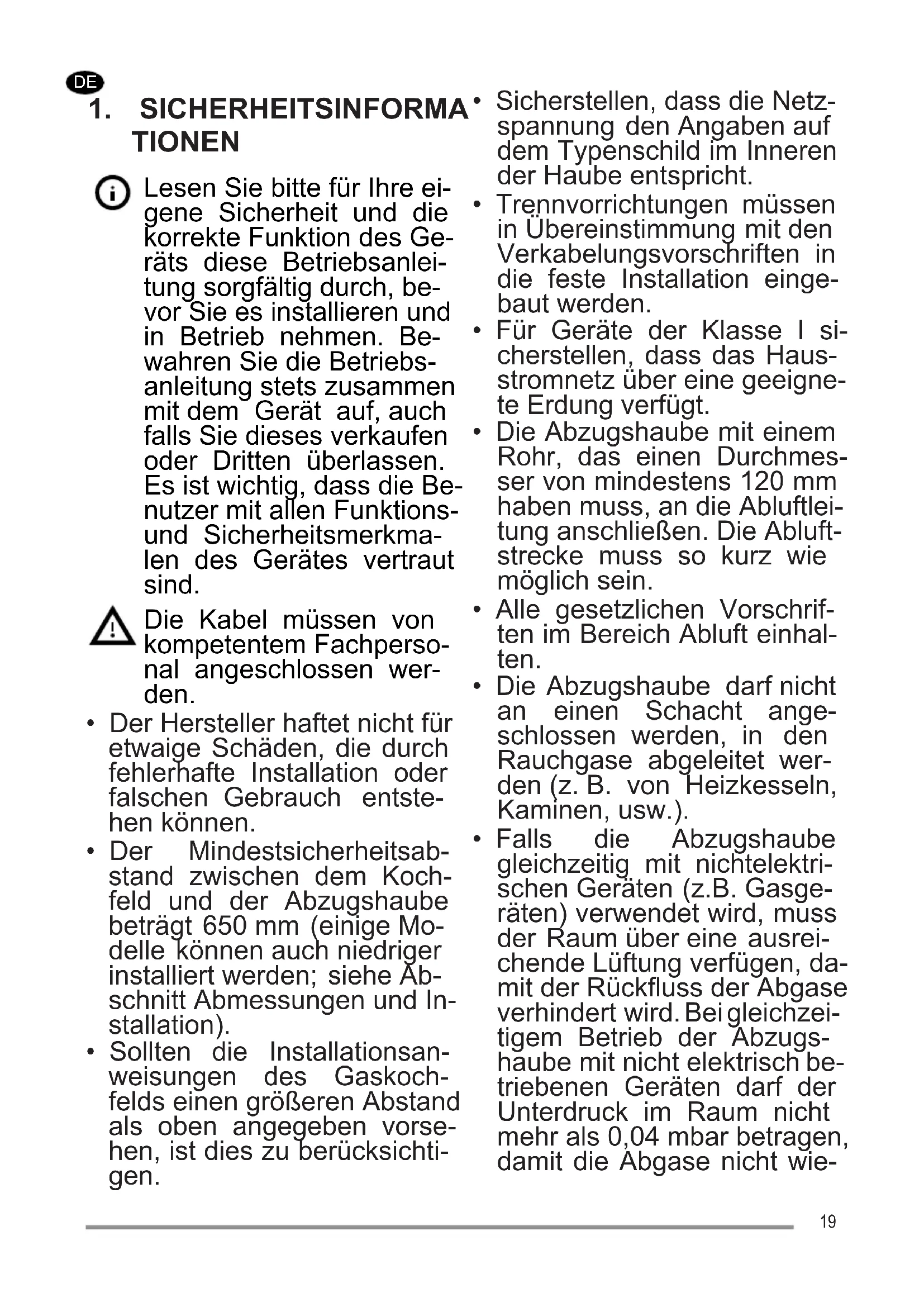 - Falls die Abzugshaube gleichzeitig mit nichtelektri- schen Geräten (z.B. Gasge- räten) verwendet wird, muss der Raum über eine ausrei- chende Lüftung verfügen, da- mit der Rückfluss der Abgase verhindert wird. Bei gleichzei- tigem Betrieb der Abzugs- haube mit nicht elektrisch be- triebenen Geräten darf der Unterdruck im Raum nicht mehr als 0,04 mbar betragen, damit die Abgase nicht wie- 19der durch die Abzugshaube in den Raum gesogen werden.