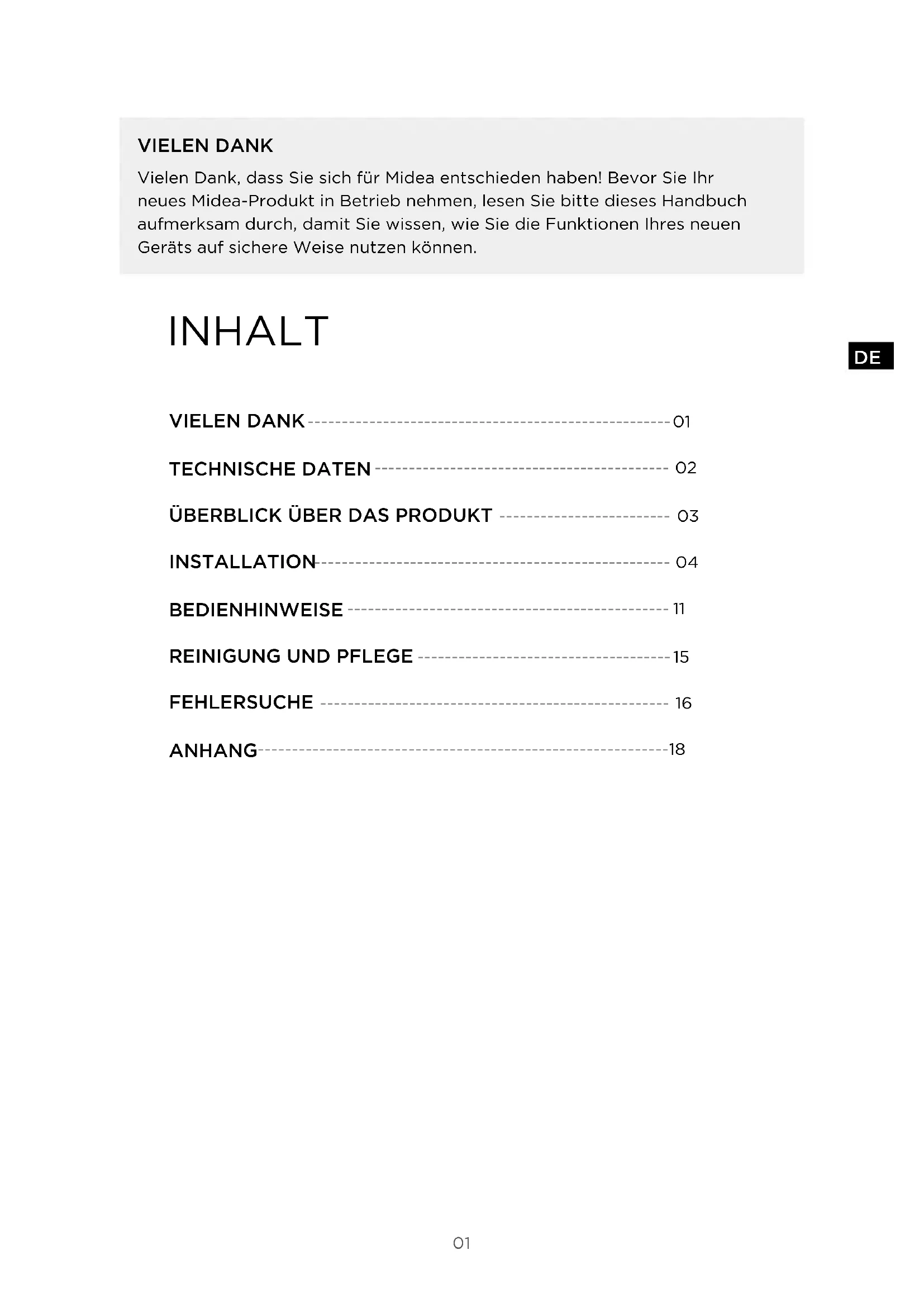 VIELEN DANK Vielen Dank, dass Sie sich für Midea entschieden haben! Bevor Sie Ihr neues Midea-Produkt in Betrieb nehmen, lesen Sie bitte dieses Handbuch aufmerksam durch, damit Sie wissen, wie Sie die Funktionen Ihres neuen Geräts auf sichere Weise nutzen können. INHALT VIELEN DANK