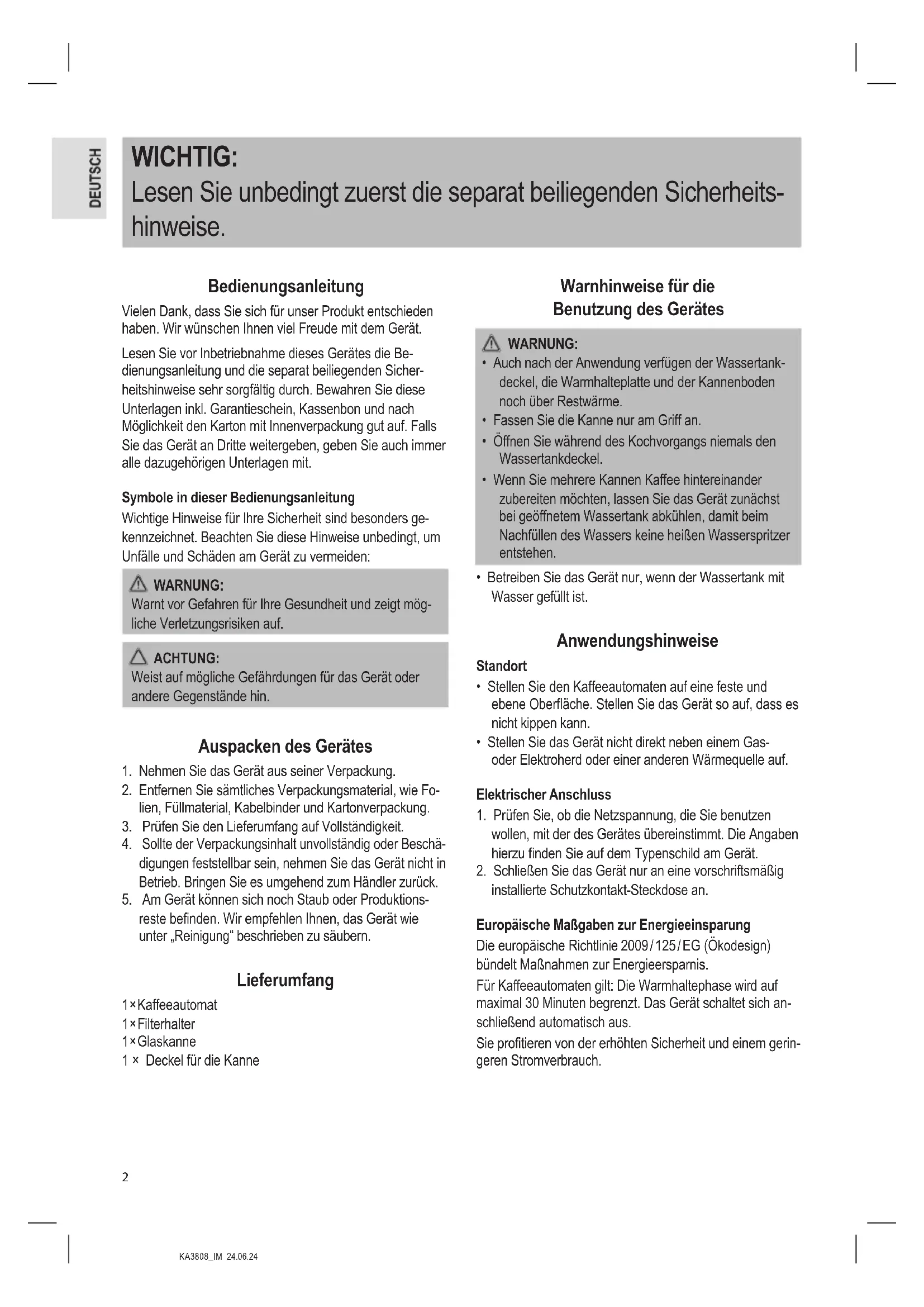 KA 3808 KA3808_IM 24.06.24 Bedienungsanleitung Instruction Manual • Gebruiksaanwijzing • Mode d’emploi Manual de instrucciones • Istruzioni per l’uso • Instrukcja obsługi / Gwarancja Használati utasítás • Руководство по эксплуатации • KAFFEEAUTOMAT Coee Machine • Koezetapparaat • Cafetière Cafetera • Caettiera • Kawiarka Kávéfőző • Кофеварка •2 KA3808_IM 24.06.24 WICHTIG: Lesen Sie unbedingt zuerst die separat beiliegenden Sicherheits- hinweise. Bedienungsanleitung Vielen Dank, dass Sie sich für unser Produkt entschieden haben. Wir wünschen Ihnen viel Freude mit dem Gerät. Lesen Sie vor Inbetriebnahme dieses Gerätes die Be- dienungsanleitung und die separat beiliegenden Sicher- heitshinweise sehr sorgfältig durch. Bewahren Sie diese Unterlagen inkl. Garantieschein, Kassenbon und nach Möglichkeit den Karton mit Innenverpackung gut auf. Falls Sie das Gerät an Dritte weitergeben, geben Sie auch immer alle dazugehörigen Unterlagen mit. Symbole in dieser Bedienungsanleitung Wichtige Hinweise für Ihre Sicherheit sind besonders ge- kennzeichnet. Beachten Sie diese Hinweise unbedingt, um Unfälle und Schäden am Gerät zu vermeiden: WARNUNG: Warnt vor Gefahren für Ihre Gesundheit und zeigt mög- liche Verletzungsrisiken auf. ACHTUNG: Weist auf mögliche Gefährdungen für das Gerät oder andere Gegenstände hin. Auspacken des Gerätes
