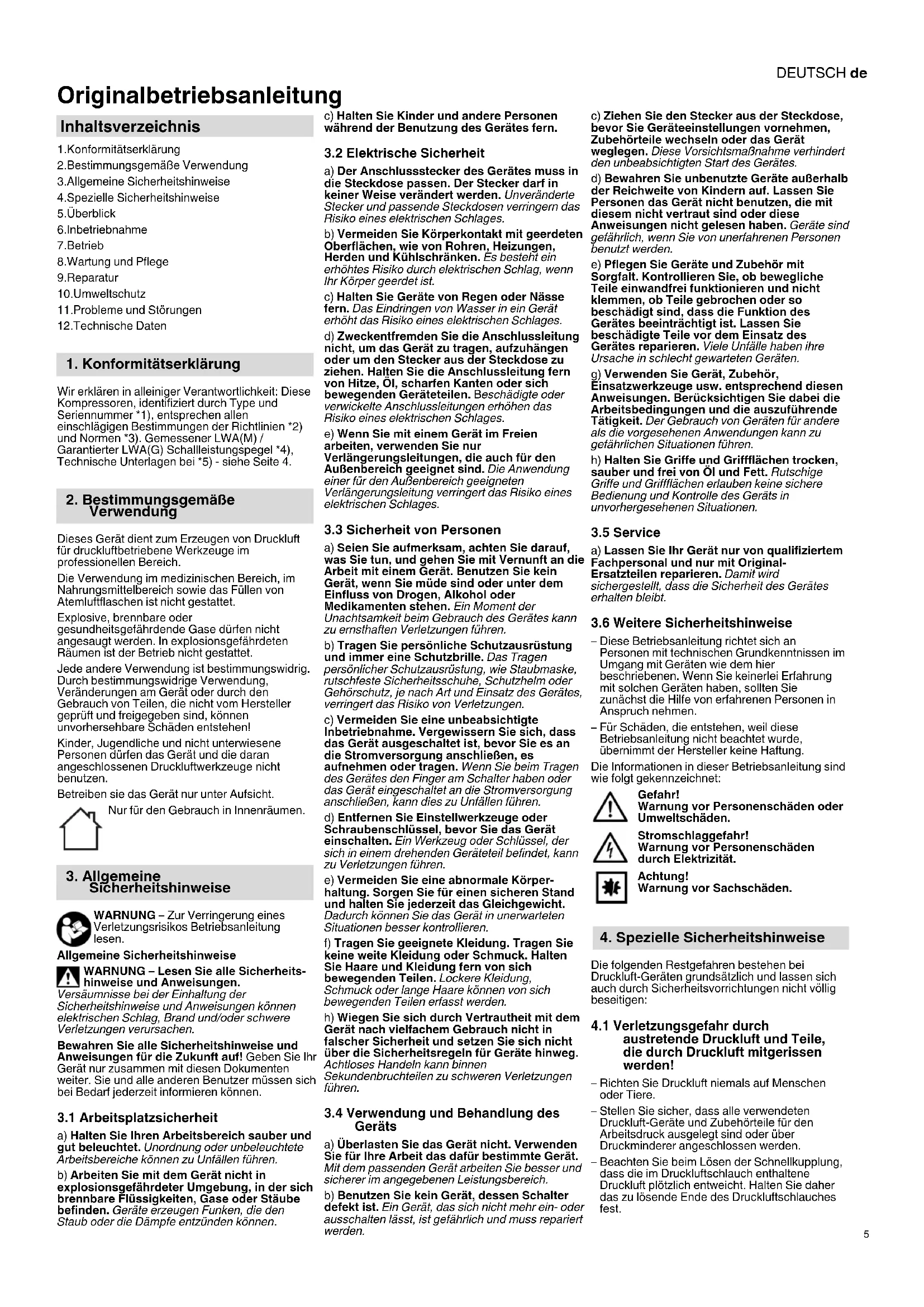 Originalbetriebsanleitung 1.Konformitätserklärung 2.Bestimmungsgemäße Verwendung 3.Allgemeine Sicherheitshinweise 4.Spezielle Sicherheitshinweise 5.Überblick 6.Inbetriebnahme 7.Betrieb 8.Wartung und Pflege 9.Reparatur 10.Umweltschutz 11.Probleme und Störungen 12.Technische Daten Wir erklären in alleiniger Verantwortlichkeit: Diese Kompressoren, identifiziert durch Type und Seriennummer *1), entsprechen allen einschlägigen Bestimmungen der Richtlinien *2) und Normen *3). Gemessener LWA(M) / Garantierter LWA(G) Schallleistungspegel *4), Technische Unterlagen bei *5) - siehe Seite 4. Dieses Gerät dient zum Erzeugen von Druckluft für druckluftbetriebene Werkzeuge im professionellen Bereich. Die Verwendung im medizinischen Bereich, im Nahrungsmittelbereich sowie das Füllen von Atemluftflaschen ist nicht gestattet. Explosive, brennbare oder gesundheitsgefährdende Gase dürfen nicht angesaugt werden. In explosionsgefährdeten Räumen ist der Betrieb nicht gestattet. Jede andere Verwendung ist bestimmungswidrig. Durch bestimmungswidrige Verwendung, Veränderungen am Gerät oder durch den Gebrauch von Teilen, die nicht vom Hersteller geprüft und freigegeben sind, können unvorhersehbare Schäden entstehen! Kinder, Jugendliche und nicht unterwiesene Personen dürfen das Gerät und die daran angeschlossenen Druckluftwerkzeuge nicht benutzen. Betreiben sie das Gerät nur unter Aufsicht. Nur für den Gebrauch in Innenräumen. WARNUNG – Zur Verringerung eines Verletzungsrisikos Betriebsanleitung lesen. Allgemeine Sicherheitshinweise WARNUNG – Lesen Sie alle Sicherheits- hinweise und Anweisungen. Versäumnisse bei der Einhaltung der Sicherheitshinweise und Anweisungen können elektrischen Schlag, Brand und/oder schwere Verletzungen verursachen. Bewahren Sie alle Sicherheitshinweise und Anweisungen für die Zukunft auf! Geben Sie Ihr Gerät nur zusammen mit diesen Dokumenten weiter. Sie und alle anderen Benutzer müssen sich bei Bedarf jederzeit informieren können.