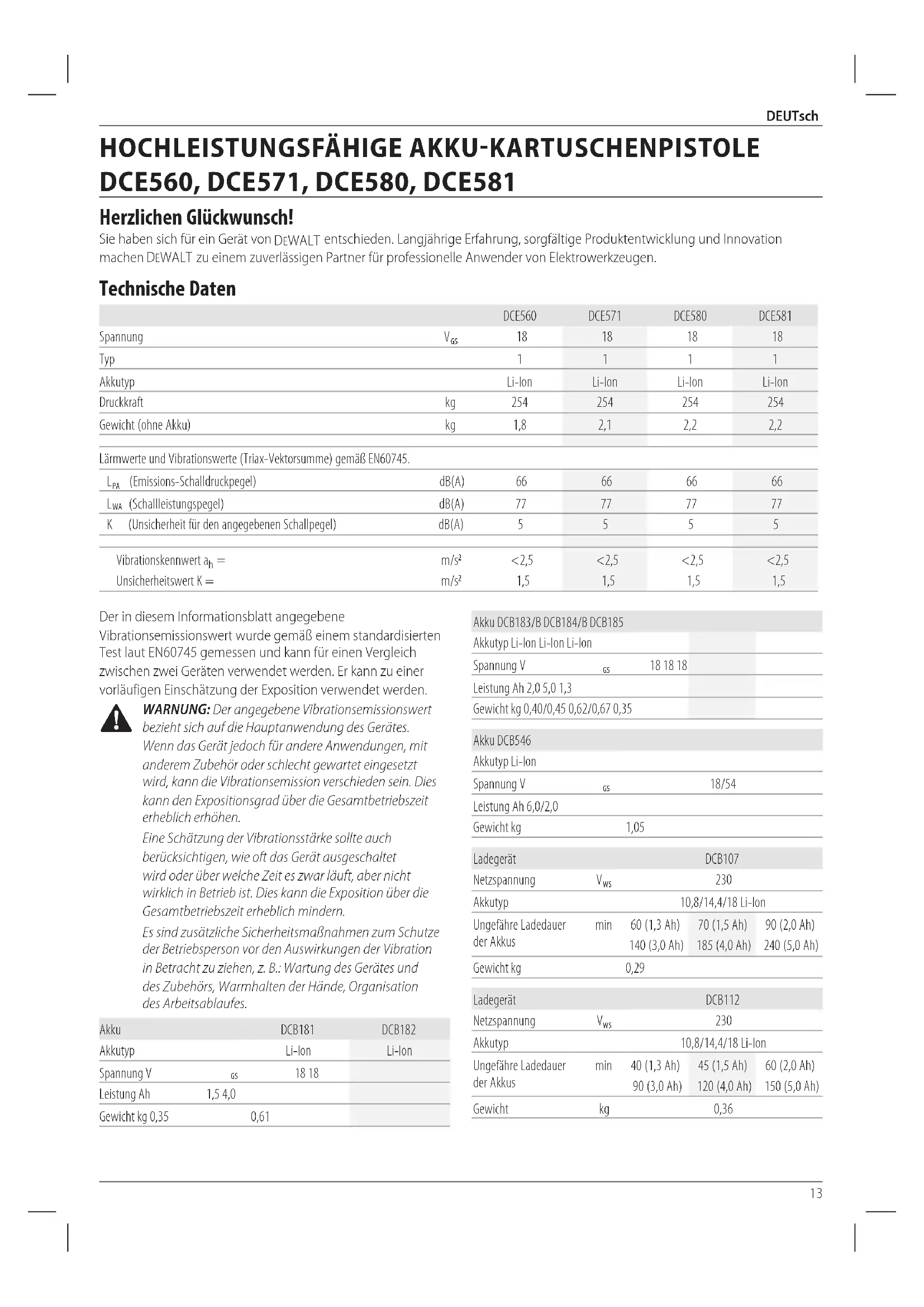 WARNUNG: Der angegebene Vibrationsemissionswert bezieht sich auf die Hauptanwendung des Gerätes. Wenn das Gerät jedoch für andere Anwendungen, mit anderem Zubehör oder schlecht gewartet eingesetzt wird, kann die Vibrationsemission verschieden sein. Dies kann den Expositionsgrad über die Gesamtbetriebszeit erheblicherhöhen. Eine Schätzung der Vibrationsstärke sollte auch berücksichtigen, wie oft das Gerät ausgeschaltet wird oder über welche Zeit es zwar läuft, aber nicht wirklich in Betrieb ist. Dies kann die Exposition über die Gesamtbetriebszeit erheblichmindern. Es sind zusätzliche Sicherheitsmaßnahmen zum Schutze der Betriebsperson vor den Auswirkungen der Vibration in Betracht zu ziehen, z.B.: Wartung des Gerätes und des Zubehörs, Warmhalten der Hände, Organisation desArbeitsablaufes. Akku DCB181 DCB182 Akkutyp Li-Ion Li-Ion Spannung V