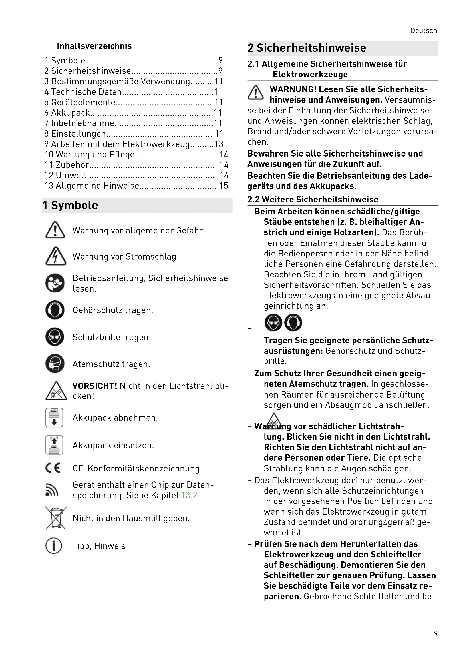 - 13 Allgemeine Hinweise 1 Symbole Warnung vor allgemeiner Gefahr Warnung vor Stromschlag Betriebsanleitung, Sicherheitshinweise lesen. Gehörschutz tragen. Schutzbrille tragen. Atemschutz tragen. VORSICHT! Nicht in den Lichtstrahl bli cken! Akkupack abnehmen. Akkupack einsetzen. CE-Konformitätskennzeichnung Gerät enthält einen Chip zur Daten speicherung. Siehe Kapitel13.2 Nicht in den Hausmüll geben. Tipp, Hinweis 2 Sicherheitshinweise p. 15