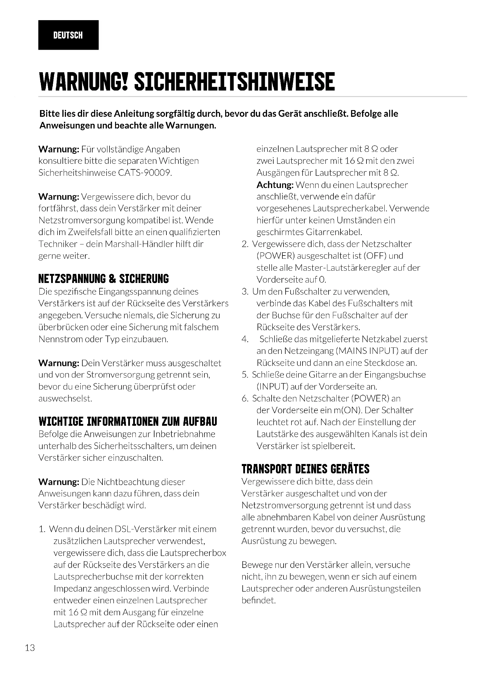 Vergewisseredichbitte,dassdein Verstärkerausgeschaltetundvonder Netzstromversorgung getrennt ist und dass alleabnehmbarenKabelvondeinerAusrüstung getrennt wurden, bevor du versuchst, die Ausrüstungzubewegen. BewegenurdenVerstärkerallein,versuche nicht, ihn zu bewegen, wenn er sich auf einem LautsprecheroderanderenAusrüstungsteilen bendet. Warnung: FürvollständigeAngaben konsultierebittedieseparatenWichtigen SicherheitshinweiseCATS-90009. Warnung: Vergewisseredich,bevordu fortfährst,dassdeinVerstärkermitdeiner Netzstromversorgungkompatibelist.Wende dichimZweifelsfallbitteaneinenqualizierten Techniker–deinMarshall-Händlerhilftdir gerne weiter. NETZSPANNUNG & SICHERUNG DiespezischeEingangsspannungdeines VerstärkersistaufderRückseitedesVerstärkers angegeben.Versucheniemals,dieSicherungzu überbrückenodereineSicherungmitfalschem Nennstrom oder Typ einzubauen. Warnung:DeinVerstärkermussausgeschaltet und von der Stromversorgung getrennt sein, bevordueineSicherungüberprüfstoder auswechselst.
