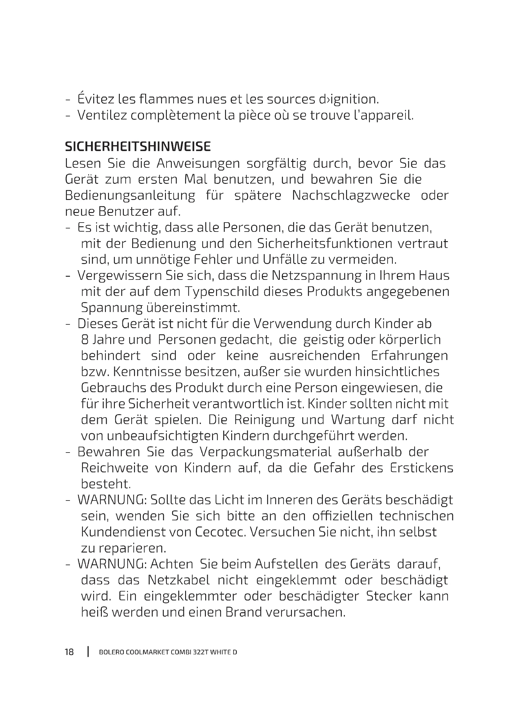 - Évitez les ammes nues et les sources d›ignition. - Ventilez complètement la pièce où se trouve l’appareil. SICHERHEITSHINWEISE Lesen Sie die Anweisungen sorgfältig durch, bevor Sie das Gerät zum ersten Mal benutzen, und bewahren Sie die Bedienungsanleitung für spätere Nachschlagzwecke oder neue Benutzer auf. - Es ist wichtig, dass alle Personen, die das Gerät benutzen, mit der Bedienung und den Sicherheitsfunktionen vertraut sind, um unnötige Fehler und Unfälle zu vermeiden. - Vergewissern Sie sich, dass die Netzspannung in Ihrem Haus mit der auf dem Typenschild dieses Produkts angegebenen Spannung übereinstimmt. - Dieses Gerät ist nicht für die Verwendung durch Kinder ab 8 Jahre und Personen gedacht, die geistig oder körperlich behindert sind oder keine ausreichenden Erfahrungen bzw. Kenntnisse besitzen, außer sie wurden hinsichtliches Gebrauchs des Produkt durch eine Person eingewiesen, die für ihre Sicherheit verantwortlich ist. Kinder sollten nicht mit dem Gerät spielen. Die Reinigung und Wartung darf nicht von unbeaufsichtigten Kindern durchgeführt werden. - Bewahren Sie das Verpackungsmaterial außerhalb der Reichweite von Kindern auf, da die Gefahr des Erstickens besteht. - WARNUNG: Sollte das Licht im Inneren des Geräts beschädigt sein, wenden Sie sich bitte an den oziellen technischen Kundendienst von Cecotec. Versuchen Sie nicht, ihn selbst zu reparieren. - WARNUNG: Achten Sie beim Aufstellen des Geräts darauf, dass das Netzkabel nicht eingeklemmt oder beschädigt wird. Ein eingeklemmter oder beschädigter Stecker kann heiß werden und einen Brand verursachen.19
