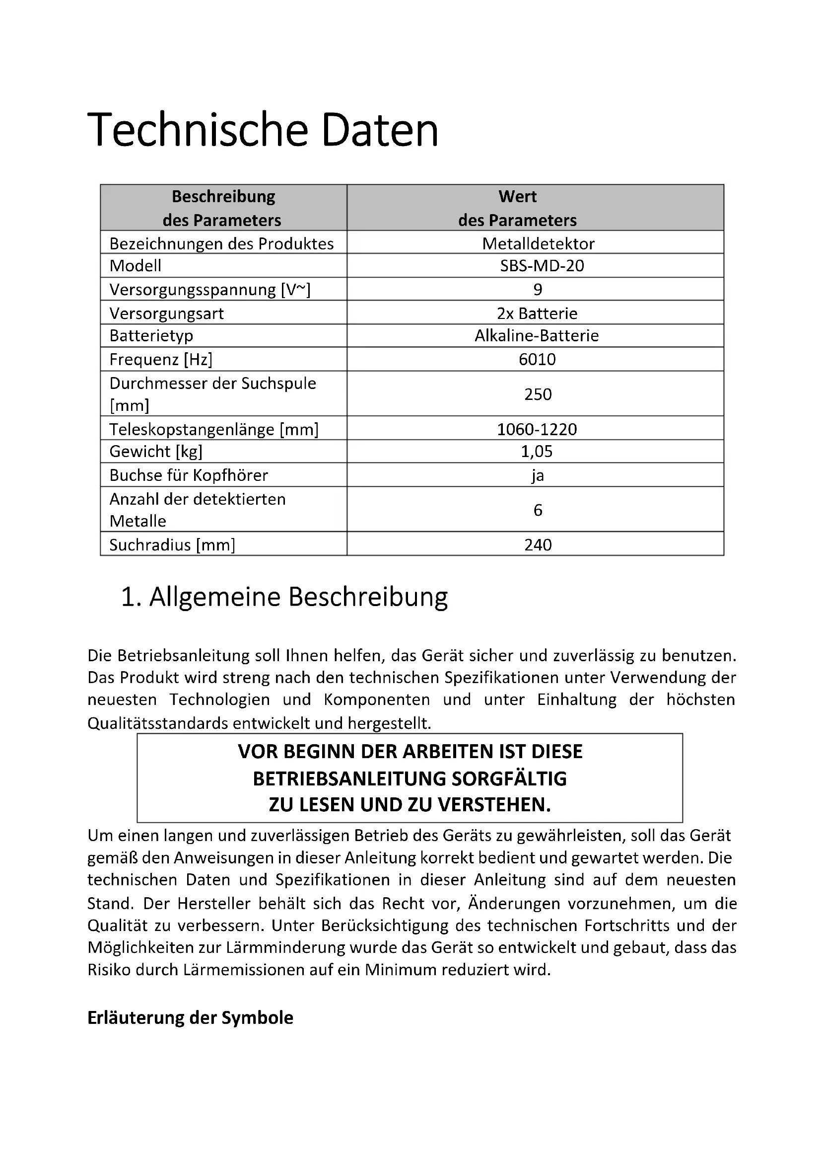 EHLERBEHEBUNG Fehler Mögliche Ursache Maßnahme Der Metalldetektor zeigt einen Messwert an oder gibt einen Signalton aus, ohne dass ein Zielobjekt erfasst wurde. Der Metalldetektor kann Störungen und falsche Signale von Sendeantennen und anderen elektrischen Leitungen aufnehmen. Suchort ändern. Es muss eine Weile abgewartet werden, bevor der Prozess erneut versucht wird. Zu hohe Umgebungsfeuchtigkeit. Der Metalldetektor gibt falsche Signale aus. Zu hohe Suchleistung / elektromagnetische Störungen der Umgebung. Suchleistung senken. Zu schnelle Bewegung oder Suchspule des Metalldetektors im falschen Winkel eingestellt. Die Suchspule muss langsamer bewegt werden und der Metalldetektor muss korrekt ausgerichtet werden. Verwendung von 2 Metalldetektoren in einer geringen Entfernung zueinander. Die beiden Metalldetektoren müssen einen Abstand von mindestens 6 Metern zueinander haben. Die Suchspule erfasst nichts. Suchleistung ist zu niedrig eingestellt. Suchleistung steigern.Die Suchspule ist nicht parallel zum Boden ausgerichtet. Die Suchspule parallel zum Boden ausrichten. Auf dem Display werden mehrere Zielobjekte gleichzeitig angezeigt oder es werden mehrere Signaltöne gleichzeitig ausgegeben. Der Metalldetektor hat mehrere Metallgegenstände erfasst. Die Suchleistung senken, um die Erfassung der tiefer gelegenen Zielobjekte zu eliminieren. Der Metalldetektor kann das Ziel nicht identifizieren. Manchmal wird durch ein oxidiertes Metall auch ein anderes Ziel und einen anderer Ton ausgelöst. Die Suchspule in verschiedenen Winkeln bewegen. Die Suchspule funktioniert nicht. Das 5-polige Kabel ist nicht korrekt angeschlossen. Das Kabel korrekt anschließen. Die Batterien sind leer. Batterien auswechseln.Technical Data Description of the parameter Value of the parameter Product name METAL DETECTOR Model SBS-MD-20 Supply voltage [V~]