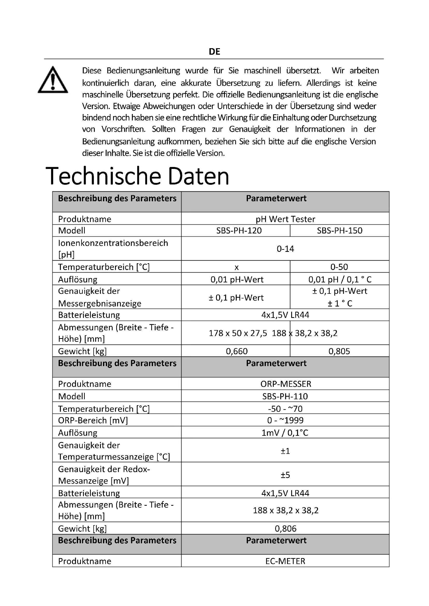 dazu die Sondenspitze in andere Kalibrierlösungen. Warten Sie, bis sich die Messung auf dem LCD-Display stabilisiert. Wenn der angezeigte Messwert den gleichen Wert wie die Kalibrierlösung hat oder innerhalb der Fehlertoleranz (+/- 0,1 pH) liegt, sollte die Kalibrierung als korrekt angesehen werden. Andernfalls müssen die Kalibrierschritte wiederholt werden. ÄNDERUNG DER TEMPERATUREINHEIT (MODELL SBS-PH-150 / SBS-PH-110) Um die Temperatureinheit (°C/F) anzupassen, wählen Sie die Einheitenumwandlungstaste. Das LCD zeigt die aktuelle Konfiguration der Temperatureinheit an. HOLD-MODUS (MODELL SBS-PH-110) Diese Funktion dient dazu, den auf der Anzeige angegebenen Messwert anzuhalten. Zum Starten drücken Sie während der Messung kurz die HOLD-Taste (5). Erneutes kurzes Drücken der Taste (5) hebt die Sperrung auf. 3.3. Reinigung und Wartung a) Lagern Sie das Gerät an einem trockenen und kühlen Ort, geschützt vor Feuchtigkeit und direkter Sonneneinstrahlung. b) Das Gerät muss regelmäßig hinsichtlich seiner technischen Leistungsfähigkeit und auf eventuelle Schäden hin überprüft werden. c) Der Akku darf nicht im Gerät gelassen werden, wenn es über einen längeren Zeitraum nicht verwendet werden soll. d) Das direkte Berühren der Messsonde mit den Händen muss vermieden werden, da sie dadurch beschädigt werden kann! e) Die Hülle der Messsonde muss immer aufgesetzt werden, wenn das Gerät über einen längeren Zeitraum nicht verwendet werden soll.DE ANWEISUNGEN ZUR SICHEREN ENTSORGUNG VON BATTERIEN: Die Geräte sind mit 1,5V LR44 Batterien ausgestattet. Entfernen Sie zum Austauschen der Batterie den Batteriefachdeckel und setzen Sie den erforderlichen Batterietyp gemäß den Polaritätsmarkierungen ein. Sichern Sie die eingebauten Batterien durch Aufsetzen der Abdeckung. Der verbrauchte Akku wird analog zum Vorgang des Einsetzens entnommen. Verbrauchte Batterien müssen an eine für die Entsorgung zuständige Sammelstelle abgegeben werden. ENTSORGUNG VON ALTGERÄTEN. Altgeräte dürfen nicht im Hausabfall entsorgt werden, sondern muss an einer Recycling-Sammelstelle für Elektro- und Elektronikgeräte abgegeben werden. Dies wird durch das Symbol, das auf dem Produkt, der Anleitung oder der Verpackung angezeigt ist, kenntlich gemacht. Die im Gerät verwendeten Materialien können entsprechend ihrer Kennzeichnung wiederverwendet werden. Durch die Wiederverwendung, die Verwendung von Materialien oder andere Formen der Nutzung gebrauchter Geräte leisten Sie einen wesentlichen Beitrag zum Schutz unserer Umwelt. Über die geeignete Entsorgungsstelle für Altgeräte informiert Sie Ihre Gemeindeverwaltung.EN Technical data Parameter description Parameter value Product name pH METER Model SBS-PH-120 SBS-PH-150 Ion concentration range [pH] 0-14 Temperature range [° C]