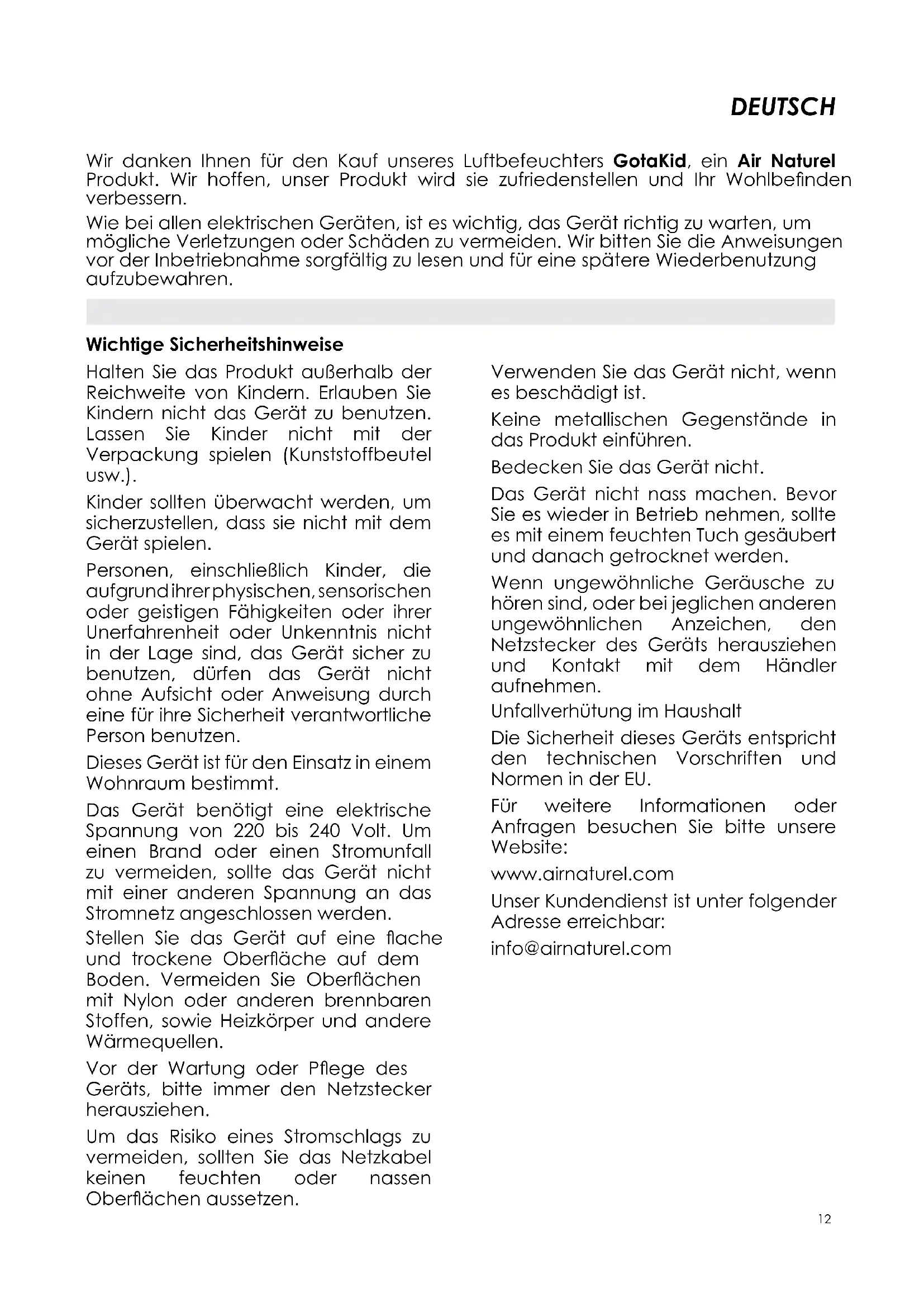 10Filtration cartridge The ltration cartridge prevents scale deposits. It screws itself inside the tank cover and stays immersed in water. It should be replaced once or twice a year depending on usage and water hardness. Extra products The product does not work properly Situation Solution The on/off light is on but no mist is produced Check the power cord. Check that the tank is correctly positioned. The on/off light is on but no mist is produced Check that the tank is lled. Check that the power knob is not set at minimum power. The mist produced has an unpleasant smell. On a new device, open the water tank and leave it aerated for 12 hours. On a used device, the smell is due to stagnant or dirty water. Clean the tank and the housing thoroughly and replace the water. The on/off light is on but the device does not work. Too much water on the ultrasonic plate : remove some water. It may also happen when moving a device full of water. Mist is produced in insufcient quantity. Dirty ultrasonic plate: clean the ultrasonic plate. Dirty or stagnant water: clean the tank and change the water. Abnormal noise. If the device has insufcient water or is not on a stable surface, a resonance can be heard. Water leakage. Check that the tank is tightly screwed and the seal (inside the tank cover) is correctly placed. The seal could have fallen when lling the device. If necessary, clean the cover with water and soap. 11DEUTSCH Halten Sie das Produkt außerhalb der Reichweite von Kindern. Erlauben Sie Kindern nicht das Gerät zu benutzen. Lassen Sie Kinder nicht mit der Verpackung spielen (Kunststoffbeutel usw.). Kinder sollten überwacht werden, um sicherzustellen, dass sie nicht mit dem Gerät spielen. Personen, einschließlich Kinder, die aufgrund ihrer physischen, sensorischen oder geistigen Fähigkeiten oder ihrer Unerfahrenheit oder Unkenntnis nicht in der Lage sind, das Gerät sicher zu benutzen, dürfen das Gerät nicht ohne Aufsicht oder Anweisung durch eine für ihre Sicherheit verantwortliche Person benutzen. Dieses Gerät ist für den Einsatz in einem Wohnraum bestimmt. Das Gerät benötigt eine elektrische Spannung von 220 bis 240 Volt. Um einen Brand oder einen Stromunfall zu vermeiden, sollte das Gerät nicht mit einer anderen Spannung an das Stromnetz angeschlossen werden. Stellen Sie das Gerät auf eine ache und trockene Oberäche auf dem Boden. Vermeiden Sie Oberächen mit Nylon oder anderen brennbaren Stoffen, sowie Heizkörper und andere Wärmequellen. Vor der Wartung oder Pege des Geräts, bitte immer den Netzstecker herausziehen. Um das Risiko eines Stromschlags zu vermeiden, sollten Sie das Netzkabel keinen feuchten oder nassen Oberächen aussetzen. Verwenden Sie das Gerät nicht, wenn es beschädigt ist. Keine metallischen Gegenstände in das Produkt einführen. Bedecken Sie das Gerät nicht. Das Gerät nicht nass machen. Bevor Sie es wieder in Betrieb nehmen, sollte es mit einem feuchten Tuch gesäubert und danach getrocknet werden. Wenn ungewöhnliche Geräusche zu hören sind, oder bei jeglichen anderen ungewöhnlichen Anzeichen, den Netzstecker des Geräts herausziehen und Kontakt mit dem Händler aufnehmen. Unfallverhütung im Haushalt Die Sicherheit dieses Geräts entspricht den technischen Vorschriften und Normen in der EU. Für weitere Informationen oder Anfragen besuchen Sie bitte unsere Website: www.airnaturel.com Unser Kundendienst ist unter folgender Adresse erreichbar: info@airnaturel.com Wir danken Ihnen für den Kauf unseres Luftbefeuchters GotaKid, ein Air Naturel Produkt. Wir hoffen, unser Produkt wird sie zufriedenstellen und Ihr Wohlbenden verbessern. Wie bei allen elektrischen Geräten, ist es wichtig, das Gerät richtig zu warten, um mögliche Verletzungen oder Schäden zu vermeiden. Wir bitten Sie die Anweisungen vor der Inbetriebnahme sorgfältig zu lesen und für eine spätere Wiederbenutzung aufzubewahren. Wichtige Sicherheitshinweise 12Technische Daten Spannung 220 - 240 V ~ 50 Hz Luftbefeuchtung 350 mL/h Abmessungen 404 x 230 x 230 mm (H x B x T) Nettogewicht 1.57 kg Stromverbrauch 30 W Wasserbehälterkapazität 3 L Geeignet für eine Raumgröße von bis zu 30 m² Max Lautstärkepegel ≤ 35 dB Feuchtigkeit gesteuert durch die elektronische Hygrostat HygroSmartR Function)