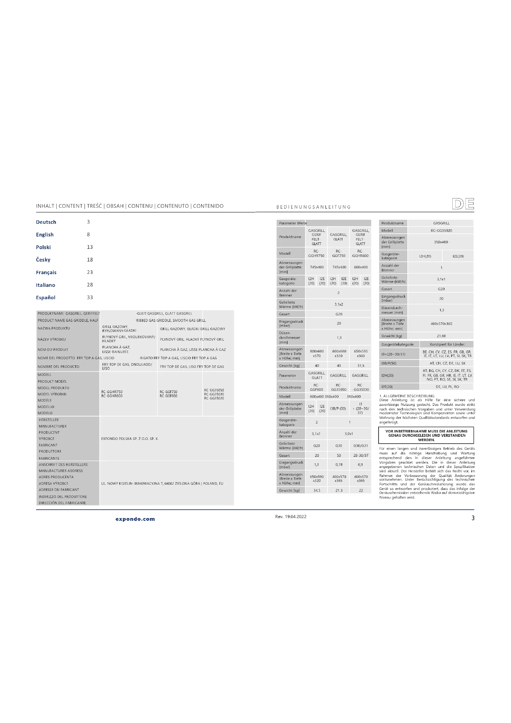 Rev. 19.04.2022 Parameter WerteProduktnameGASGRILL, GERIF FELT-GLATTGASGRILL, GLATTGASGRILL, GERIF FELT- GLATTModell RC- GGHR750 RC- GGF750 RC- GGHR600Abmessungen der Grillplatte [mm] 745x400 745x400 600x400Gasgeräte- kategorie I2H (20) I2E (20) I2H (20) I2E (20) I2H (20) I2E (20) Anzahl der Brenner Gelieferte Wärme (kW/h)3,1x2Gasart G20Eingangsdruck (mbar) Düsen- durchmesser [mm] 1,3 Abmessungen [Breite x Tiefe x Höhe; mm]800x600 x370 800x600 x320 650x595 x360 Gewicht [kg] 40 41 31,5ParameterGASGRILL, GLATT GASGRILL GASGRILLProduktname RC- GGF600 RC- GG35050RC--GG35030Modell 600x400 350x400 350x400Abmessungen der Grillplatte [mm] I2H (20) I2E (20) I3B/P (50) + (28~30/ 37) Gasgeräte-kategorie2 1Anzahl der Brenner3,1x2 3,0x1 Gelieferte Wärme (kW/h)G20 G30 G30/G31Gasart 20 50 28-30/37Eingangsdruck (mbar)1,3 0,78 0,9Abmessungen [Breite x Tiefe x Höhe; mm]650x590 x320 400x570 x365 400x570 x365 Gewicht [kg] 34,5 21,3 22Produktname GASGRILLModell RC-GG35020Abmessungen der Grillplatte [mm] 350x400Gasgeräte-kategorieI2H(20) I2E(20)Anzahl der Brenner Gelieferte Wärme (kW/h)3,1x1 Gasart G20 Eingangsdruck (mbar) Düsendurch-messer [mm] 1,3 Abmessungen [Breite x Tiefe x Höhe; mm]400x570x365Gewicht [kg] 21,60Gasgerätekategorie Konzipiert für Länder:I3+(28~30/37)BE, CH, CY, CZ, ES, FR, GB, GR, IE, IT, LT, LU, LV, PT, SI, SK, TRI3B/P(50) AT, CH, CZ, DE, LU, SKI2H(20) AT, BG, CH, CY, CZ, DK, EE, ES, FI, FR, GB, GR, HR, IE, IT, LT, LV, NO, PT, RO, SE, SI, SK, TRI2E(20) DE, LU, PL, RO1. ALLGEMEINE BESCHREIBUNGDiese Anleitung ist als Hilfe für eine sichere und zuverlässige Nutzung gedacht. Das Produkt wurde strikt nach den technischen Vorgaben und unter Verwendung modernster Technologien und Komponenten sowie unter Wahrung der höchsten Qualitätsstandards entworfen und angefertigt. VOR INBETRIEBNAHME MUSS DIE ANLEITUNG GENAU DURCHGELESEN UND VERSTANDEN WERDEN.
