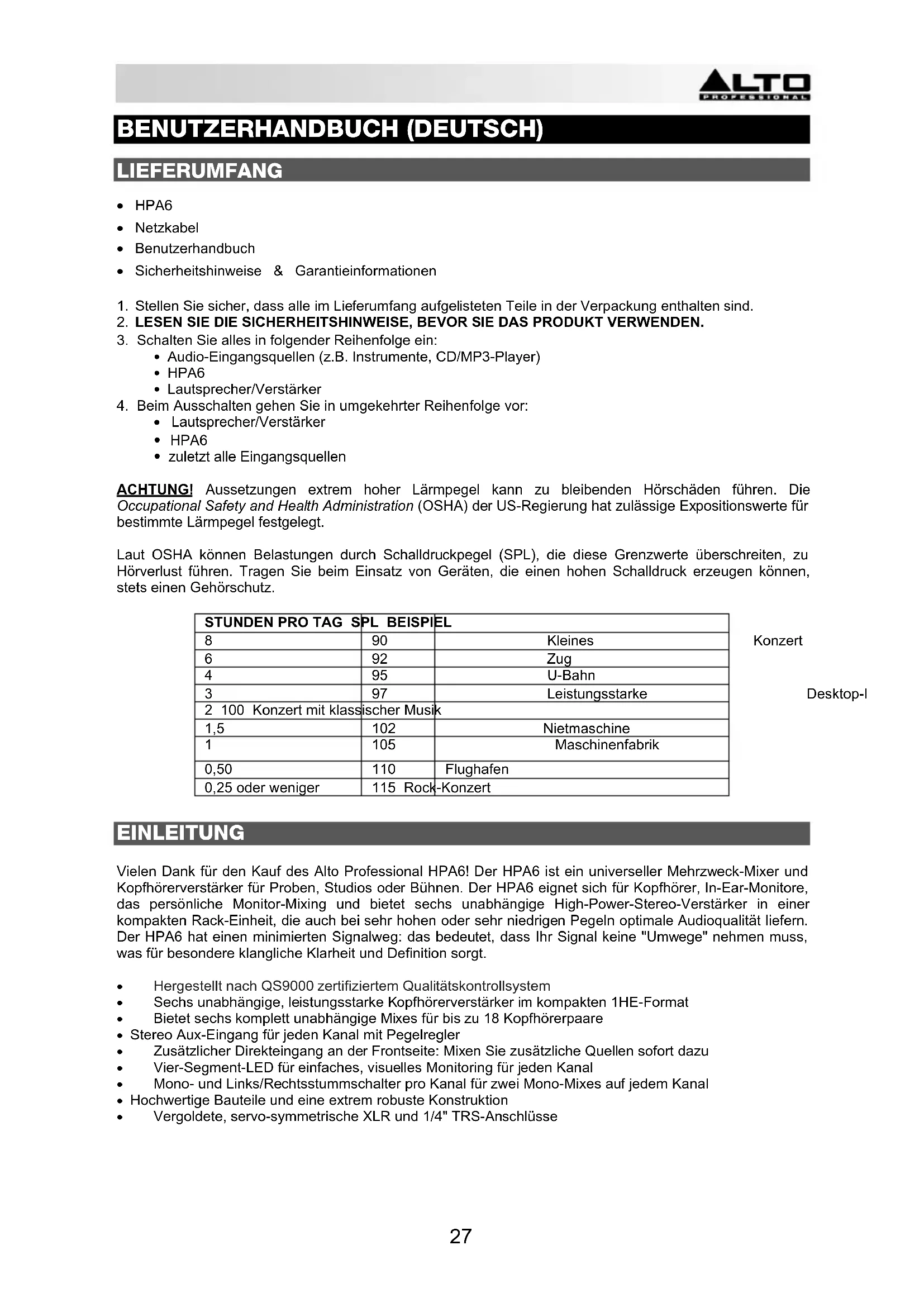 - zuletzt alle Eingangsquellen ACHTUNG! Aussetzungen extrem hoher Lärmpegel kann zu bleibenden Hörschäden führen. Die Occupational Safety and Health Administration (OSHA) der US-Regierung hat zulässige Expositionswerte für bestimmte Lärmpegel festgelegt. Laut OSHA können Belastungen durch Schalldruckpegel (SPL), die diese Grenzwerte überschreiten, zu Hörverlust führen. Tragen Sie beim Einsatz von Geräten, die einen hohen Schalldruck erzeugen können, stets einen Gehörschutz.