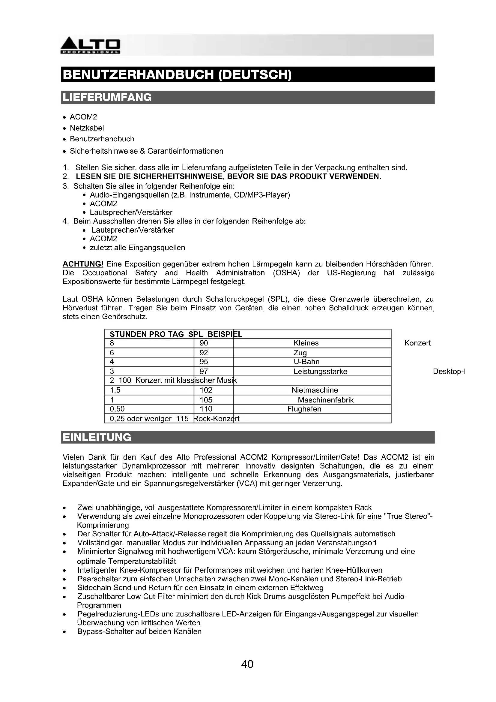 8 90 Kleines Konzert 6 92 Zug 4 95 U-Bahn 3 97 Leistungsstarke Desktop-Monitore 2 100 Konzert mit klassischer Musik 1,5 102 Nietmaschine 1 105 Maschinenfabrik 0,50 110 Flughafen 0,25 oder weniger 115 Rock-Konzert EINLEITUNG Vielen Dank für den Kauf des Alto Professional ACOM2 Kompressor/Limiter/Gate! Das ACOM2 ist ein leistungsstarker Dynamikprozessor mit mehreren innovativ designten Schaltungen, die es zu einem vielseitigen Produkt machen: intelligente und schnelle Erkennung des Ausgangsmaterials, justierbarer Expander/Gate und ein Spannungsregelverstärker (VCA) mit geringer Verzerrung.