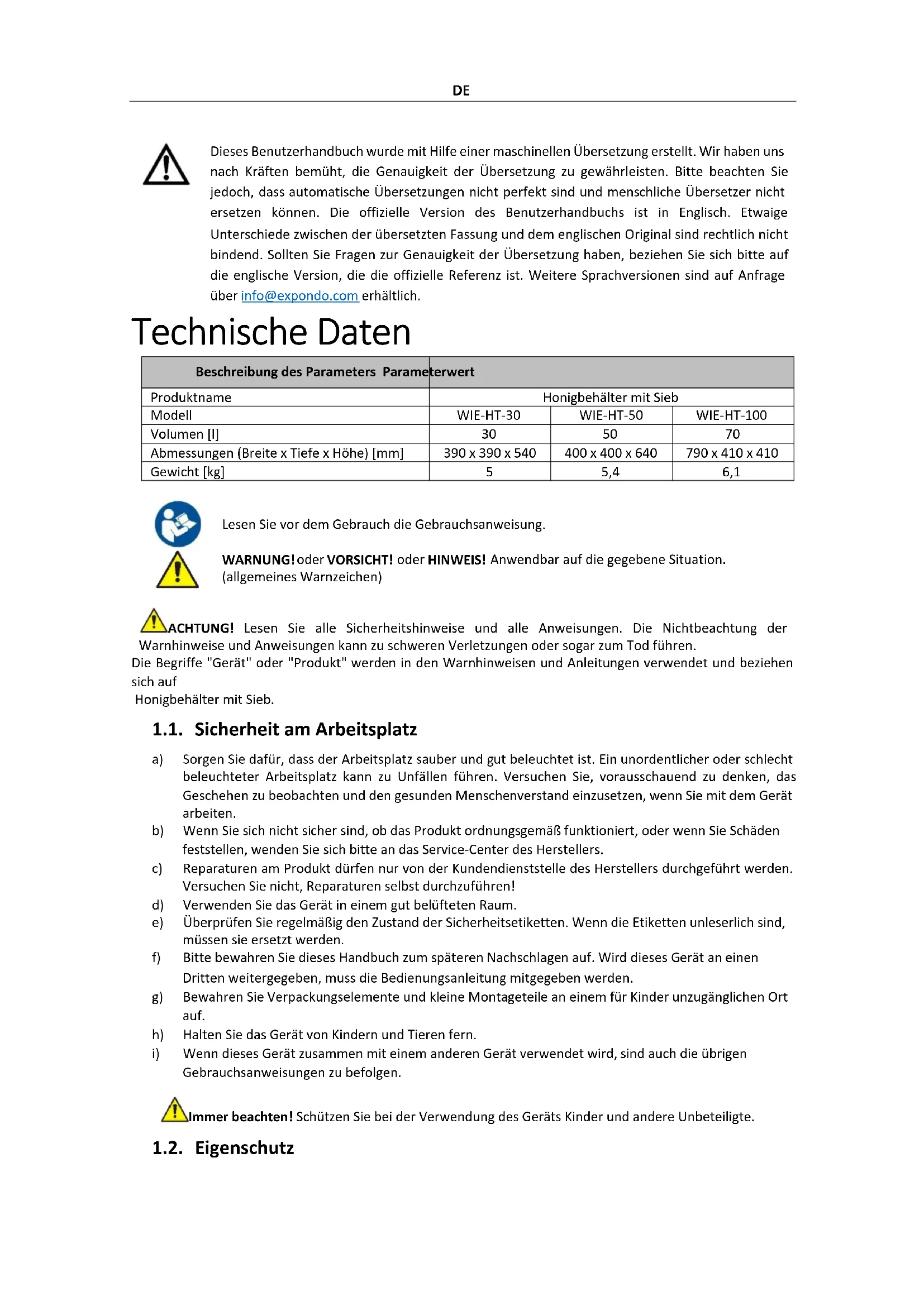 WARNUNG! oder VORSICHT! oder HINWEIS! Anwendbar auf die gegebene Situation. (allgemeines Warnzeichen) ACHTUNG! Lesen Sie alle Sicherheitshinweise und alle Anweisungen. Die Nichtbeachtung der Warnhinweise und Anweisungen kann zu schweren Verletzungen oder sogar zum Tod führen. Die Begriffe "Gerät" oder "Produkt" werden in den Warnhinweisen und Anleitungen verwendet und beziehen sich auf Honigbehälter mit Sieb. 1.1. Sicherheit am Arbeitsplatz a) Sorgen Sie dafür, dass der Arbeitsplatz sauber und gut beleuchtet ist. Ein unordentlicher oder schlecht beleuchteter Arbeitsplatz kann zu Unfällen führen. Versuchen Sie, vorausschauend zu denken, das Geschehen zu beobachten und den gesunden Menschenverstand einzusetzen, wenn Sie mit dem Gerät arbeiten. b) Wenn Sie sich nicht sicher sind, ob das Produkt ordnungsgemäß funktioniert, oder wenn Sie Schäden feststellen, wenden Sie sich bitte an das Service-Center des Herstellers. c) Reparaturen am Produkt dürfen nur von der Kundendienststelle des Herstellers durchgeführt werden. Versuchen Sie nicht, Reparaturen selbst durchzuführen! d) Verwenden Sie das Gerät in einem gut belüfteten Raum. e) Überprüfen Sie regelmäßig den Zustand der Sicherheitsetiketten. Wenn die Etiketten unleserlich sind, müssen sie ersetzt werden. f) Bitte bewahren Sie dieses Handbuch zum späteren Nachschlagen auf. Wird dieses Gerät an einen Dritten weitergegeben, muss die Bedienungsanleitung mitgegeben werden. g) Bewahren Sie Verpackungselemente und kleine Montageteile an einem für Kinder unzugänglichen Ort auf. h) Halten Sie das Gerät von Kindern und Tieren fern.