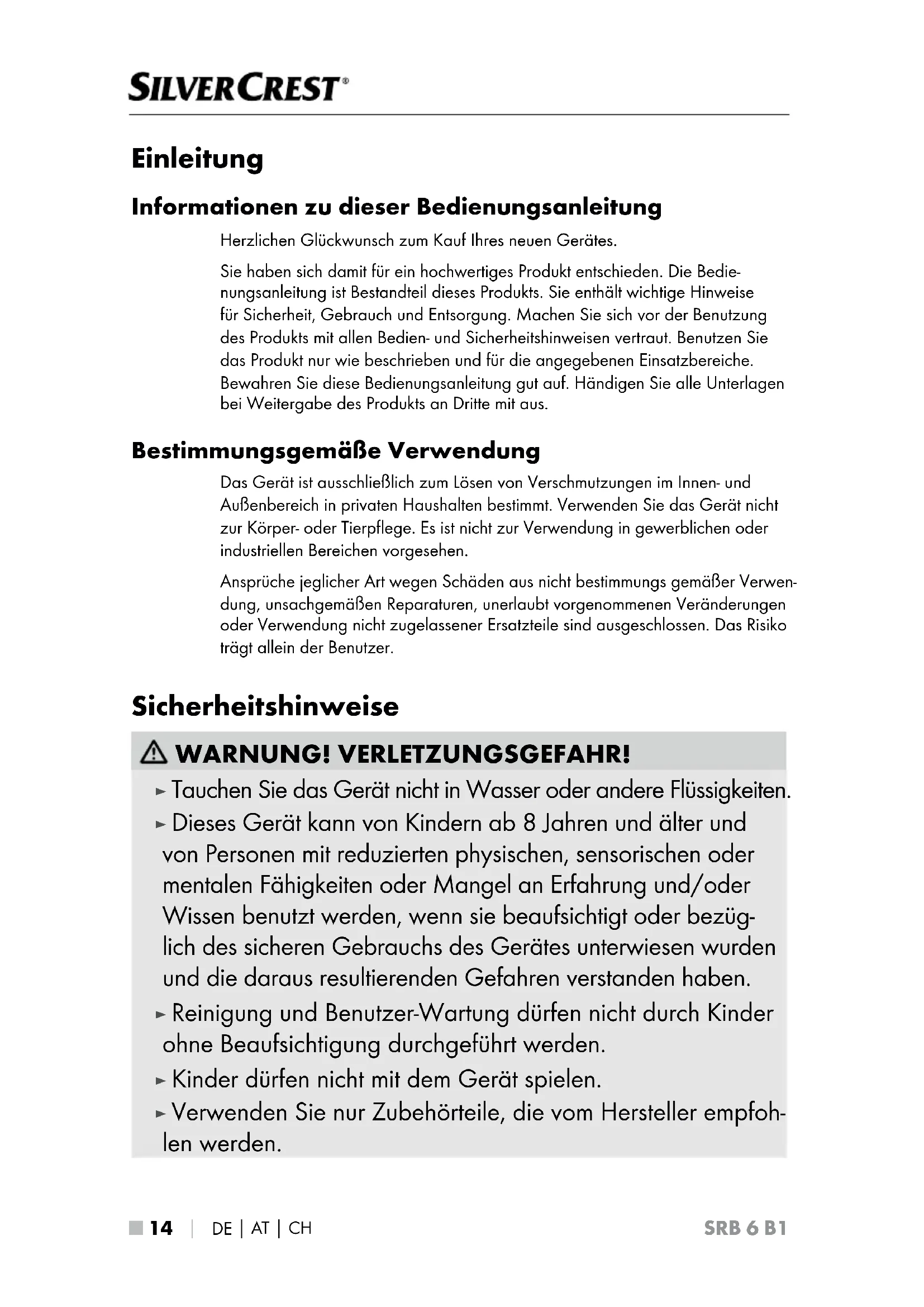 SRB 6 B1 Einleitung Informationen zu dieser Bedienungsanleitung Herzlichen Glückwunsch zum Kauf Ihres neuen Gerätes. Sie haben sich damit für ein hochwertiges Produkt entschieden. Die Bedie- nungsanleitung ist Bestandteil dieses Produkts. Sie enthält wichtige Hinweise für Sicherheit, Gebrauch und Entsorgung. Machen Sie sich vor der Benutzung des Produkts mit allen Bedien- und Sicherheitshinweisen vertraut. Benutzen Sie das Produkt nur wie beschrieben und für die angegebenen Einsatzbereiche. Bewahren Sie diese Bedienungsanleitung gut auf. Händigen Sie alle Unterlagen bei Weitergabe des Produkts an Dritte mit aus. Bestimmungsgemäße Verwendung Das Gerät ist ausschließlich zum Lösen von Verschmutzungen im Innen- und Außenbereich in privaten Haushalten bestimmt. Verwenden Sie das Gerät nicht zur Körper- oder Tierpflege. Es ist nicht zur Verwendung in gewerblichen oder industriellen Bereichen vorgesehen. Ansprüche jeglicher Art wegen Schäden aus nicht bestimmungs gemäßer Verwen- dung, unsachgemäßen Reparaturen, unerlaubt vorgenommenen Veränderungen oder Verwendung nicht zugelassener Ersatzteile sind ausgeschlossen. Das Risiko trägt allein der Benutzer. Sicherheitshinweise WARNUNG! VERLETZUNGSGEFAHR! ► Tauchen Sie das Gerät nicht in Wasser oder andere Flüssigkeiten. ► Dieses Gerät kann von Kindern ab 8 Jahren und älter und von Personen mit reduzierten physischen, sensorischen oder mentalen Fähigkeiten oder Mangel an Erfahrung und/oder Wissen benutzt werden, wenn sie beaufsichtigt oder bezüg- lich des sicheren Gebrauchs des Gerätes unterwiesen wurden und die daraus resultierenden Gefahren verstanden haben. ► Reinigung und Benutzer-Wartung dürfen nicht durch Kinder ohne Beaufsichtigung durchgeführt werden. ► Kinder dürfen nicht mit dem Gerät spielen. ► Verwenden Sie nur Zubehörteile, die vom Hersteller empfoh- len werden.DE