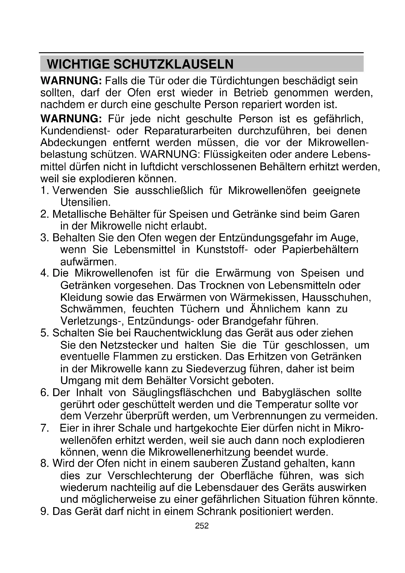 +252 WICHTIGE SCHUTZKLAUSELN WARNUNG: Falls die Tür oder die Türdichtungen beschädigt sein sollten, darf der Ofen erst wieder in Betrieb genommen werden, nachdem er durch eine geschulte Person repariert worden ist. WARNUNG: Für jede nicht geschulte Person ist es gefährlich, Kundendienst- oder Reparaturarbeiten durchzuführen, bei denen Abdeckungen entfernt werden müssen, die vor der Mikrowellen- belastung schützen. WARNUNG: Flüssigkeiten oder andere Lebens- mittel dürfen nicht in luftdicht verschlossenen Behältern erhitzt werden, weil sie explodieren können.