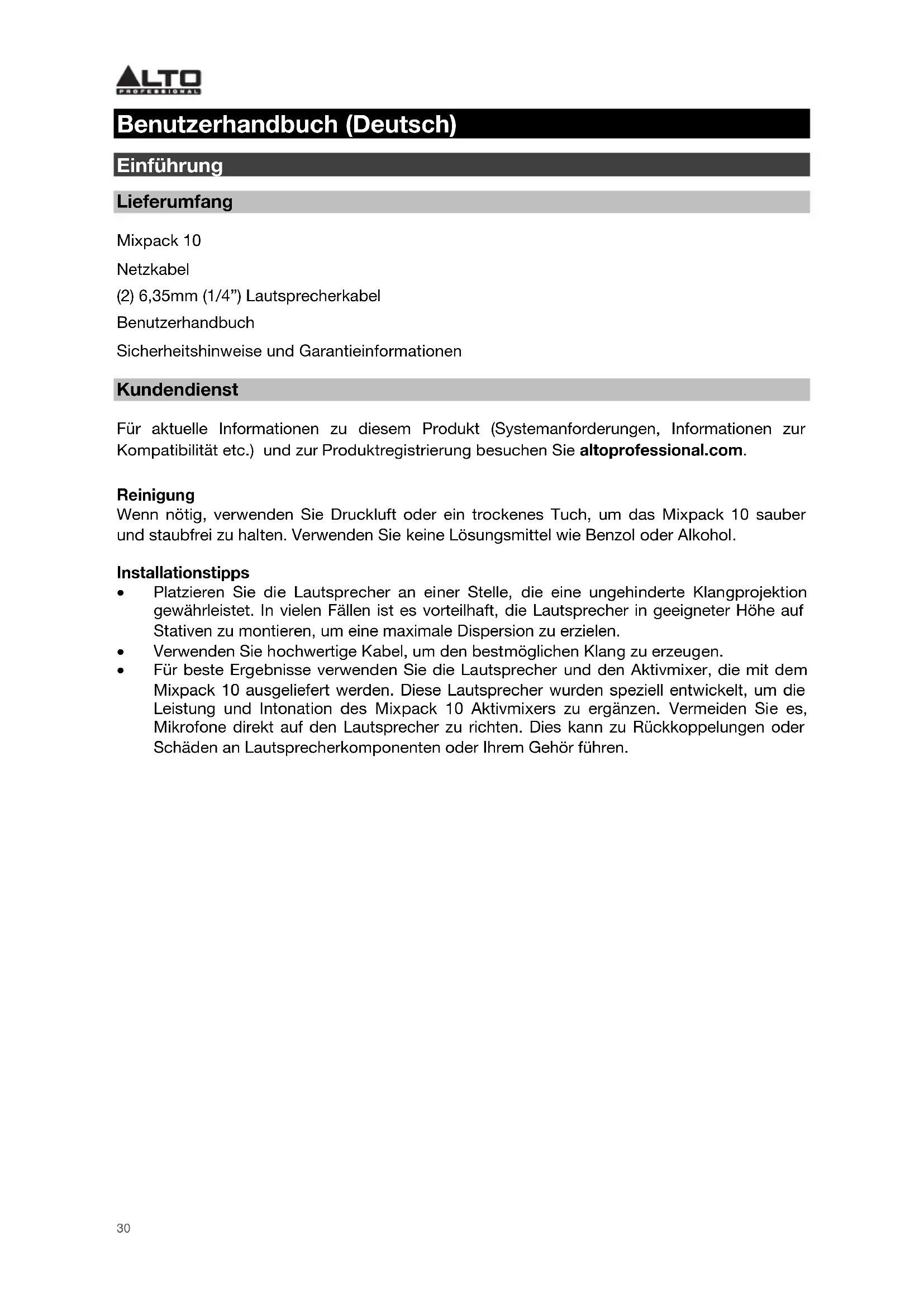 Benutzerhandbuch (Deutsch) Einführung Lieferumfang Mixpack 10 Netzkabel (2) 6,35mm (1/4”) Lautsprecherkabel Benutzerhandbuch Sicherheitshinweise und Garantieinformationen Kundendienst Für aktuelle Informationen zu diesem Produkt (Systemanforderungen, Informationen zur Kompatibilität etc.) und zur Produktregistrierung besuchen Sie altoprofessional.com. Reinigung Wenn nötig, verwenden Sie Druckluft oder ein trockenes Tuch, um das Mixpack 10 sauber und staubfrei zu halten. Verwenden Sie keine Lösungsmittel wie Benzol oder Alkohol. Installationstipps