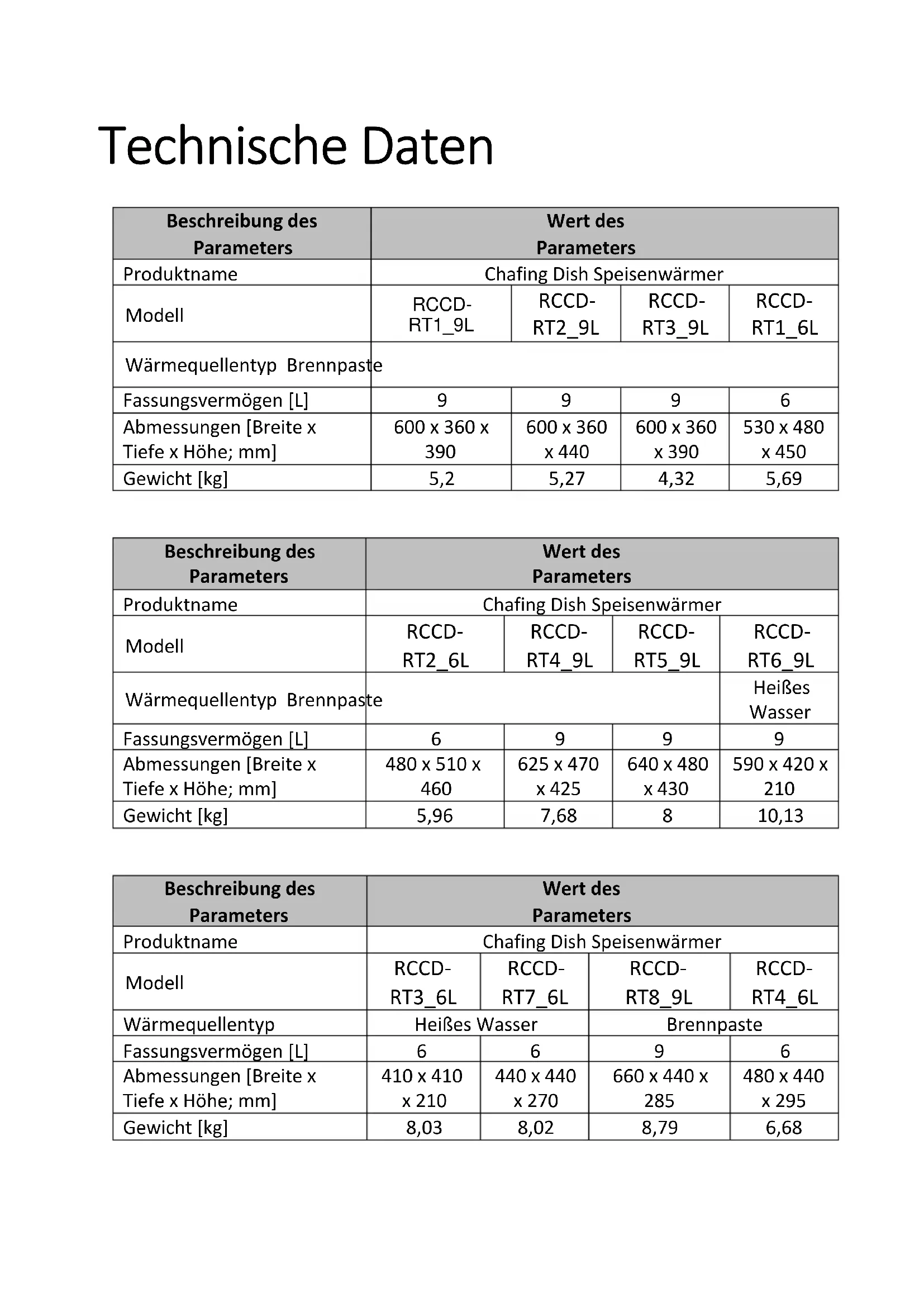 Beschreibung des Parameters Wert des Parameters Produktname Chafing Dish Speisenwärmer Modell RCCD- RT3_6L RCCD- RT7_6L RCCD- RT8_9L RCCD- RT4_6L Wärmequellentyp Heißes Wasser Brennpaste Fassungsvermögen [L]