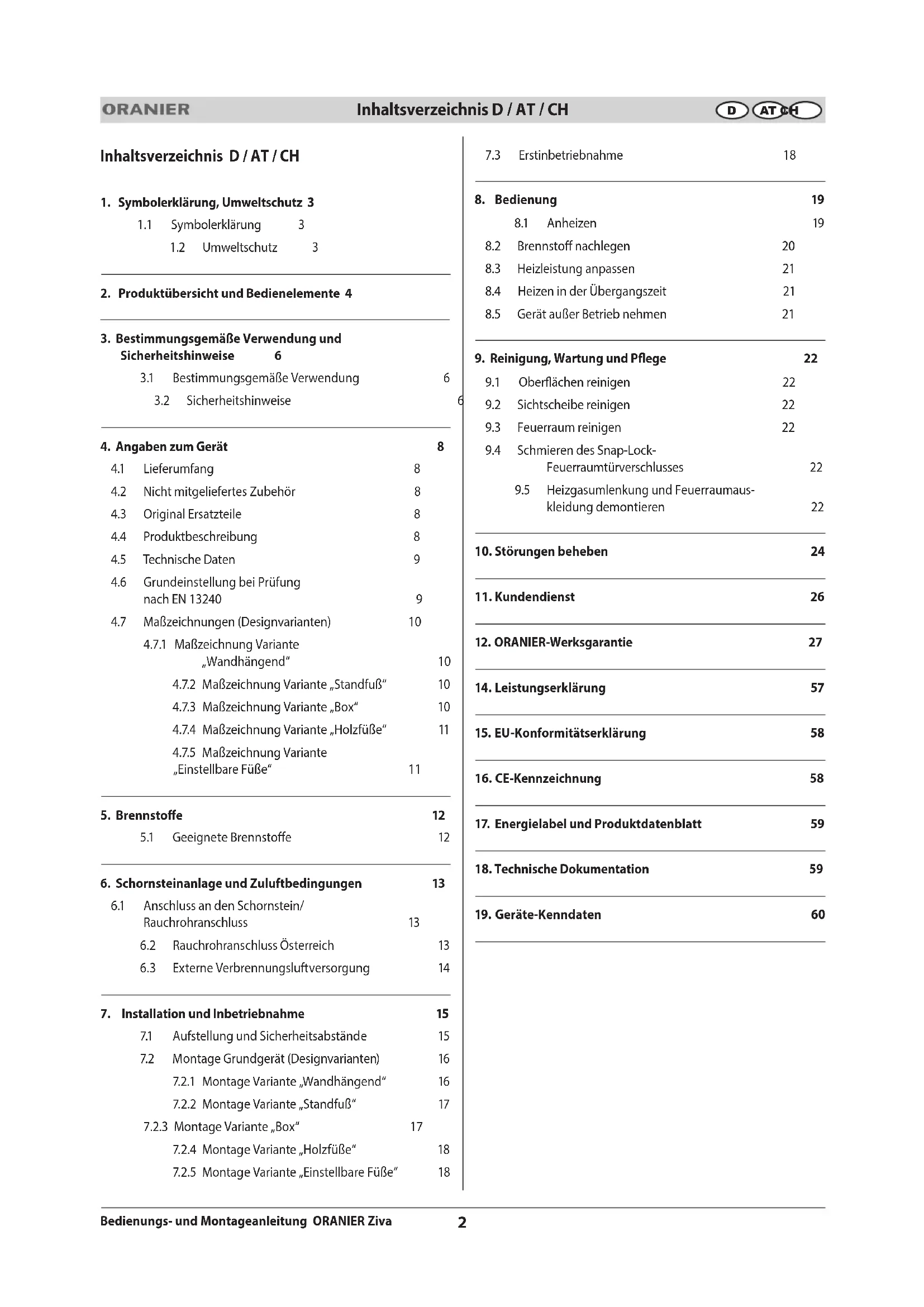 Bedienungs- und Montageanleitung ORANIER Ziva Inhaltsverzeichnis D / AT / CH AT CH Inhaltsverzeichnis D / AT / CH
