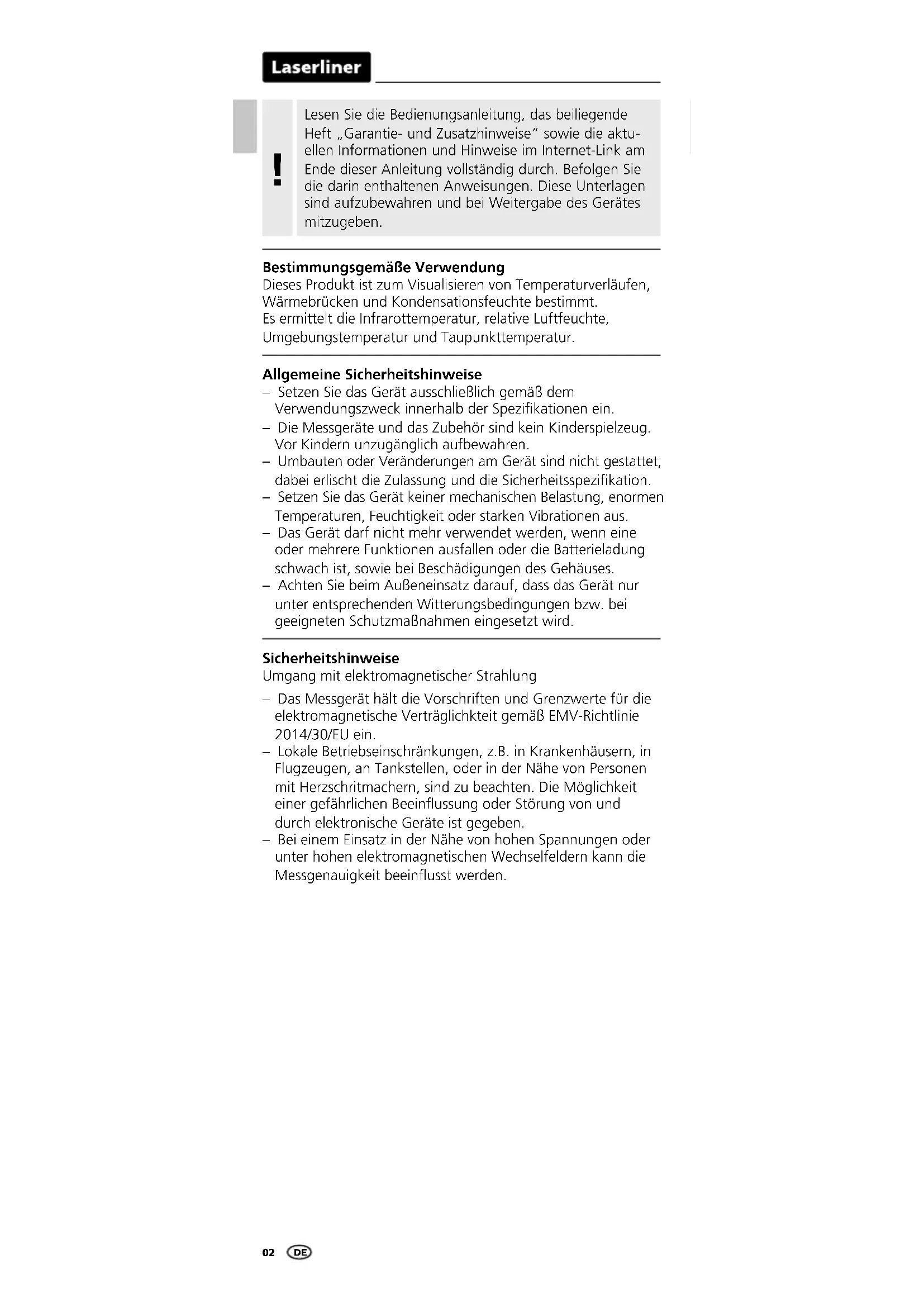 Bestimmungsgemäße Verwendung Dieses Produkt ist zum Visualisieren von Temperaturverläufen, Wärmebrücken und Kondensationsfeuchte bestimmt. Es ermittelt die Infrarottemperatur, relative Luftfeuchte, Umgebungstemperatur und Taupunkttemperatur. Lesen Sie die Bedienungsanleitung, das beiliegende Heft „Garantie- und Zusatzhinweise“ sowie die aktu- ellen Informationen und Hinweise im Internet-Link am Ende dieser Anleitung vollständig durch. Befolgen Sie die darin enthaltenen Anweisungen. Diese Unterlagen sind aufzubewahren und bei Weitergabe des Gerätes mitzugeben.