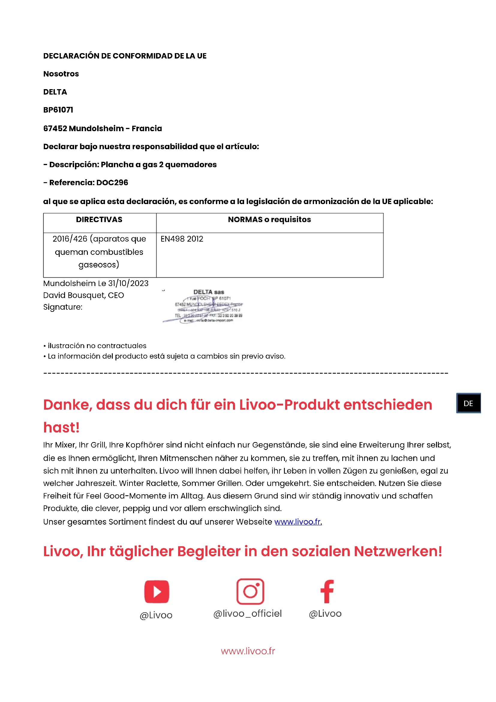 Wir DELTA BP61071 67452 Mundolsheim - Frankreich Erklären in eigener Verantwortung, dass der Artikel : - Beschreibung: Plancha-gaz-2-Brenner - Referenz: DOC296 auf den sich diese Erklärung bezieht, den einschlägigen Harmonisierungsrechtsvorschriften der Union entspricht :www.livoo.fr RICHTLINIEN NORMEN oder Anforderungen.