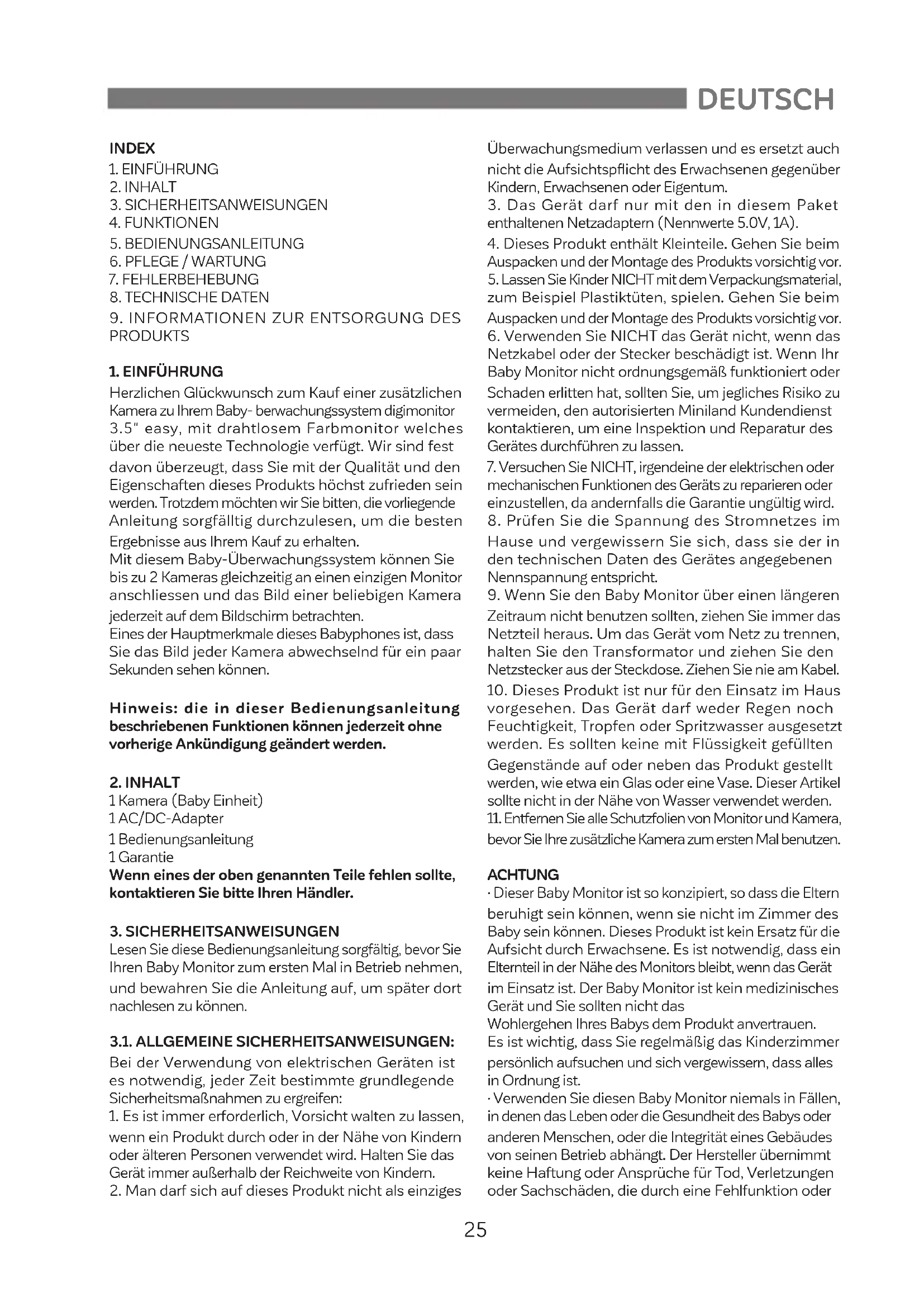 Die Kamera (Babyeinheit) dieses Babyphones ist für dem mitgelieferten AC/DC-Adapter ausgelegt.DEUTSCH