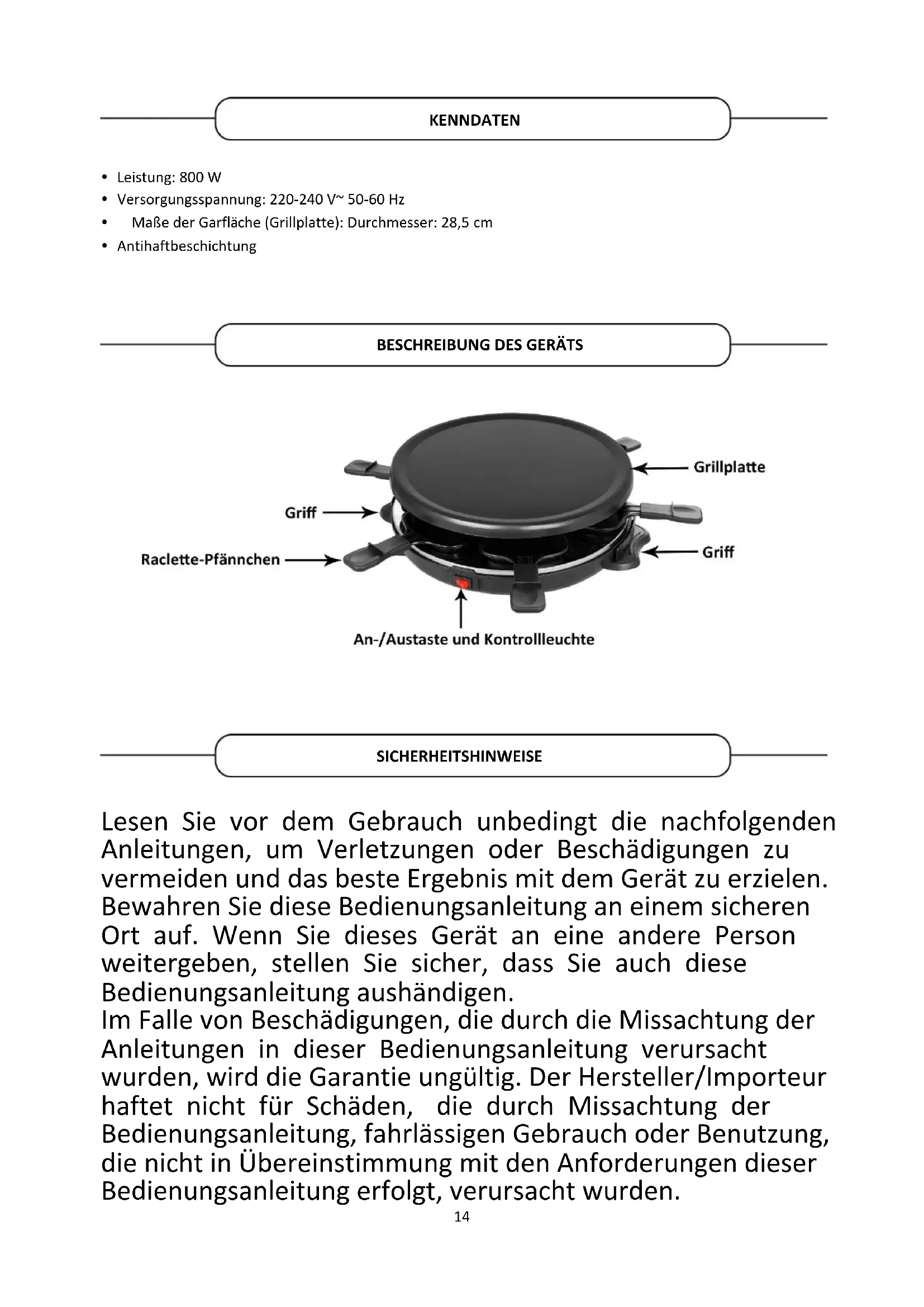 Lesen Sie vor dem Gebrauch unbedingt die nachfolgenden Anleitungen, um Verletzungen oder Beschädigungen zu vermeiden und das beste Ergebnis mit dem Gerät zu erzielen. Bewahren Sie diese Bedienungsanleitung an einem sicheren Ort auf. Wenn Sie dieses Gerät an eine andere Person weitergeben, stellen Sie sicher, dass Sie auch diese Bedienungsanleitung aushändigen. Im Falle von Beschädigungen, die durch die Missachtung der Anleitungen in dieser Bedienungsanleitung verursacht wurden, wird die Garantie ungültig. Der Hersteller/Importeur haftet nicht für Schäden, die durch Missachtung der Bedienungsanleitung, fahrlässigen Gebrauch oder Benutzung, die nicht in Übereinstimmung mit den Anforderungen dieser Bedienungsanleitung erfolgt, verursacht wurden. KENNDATEN