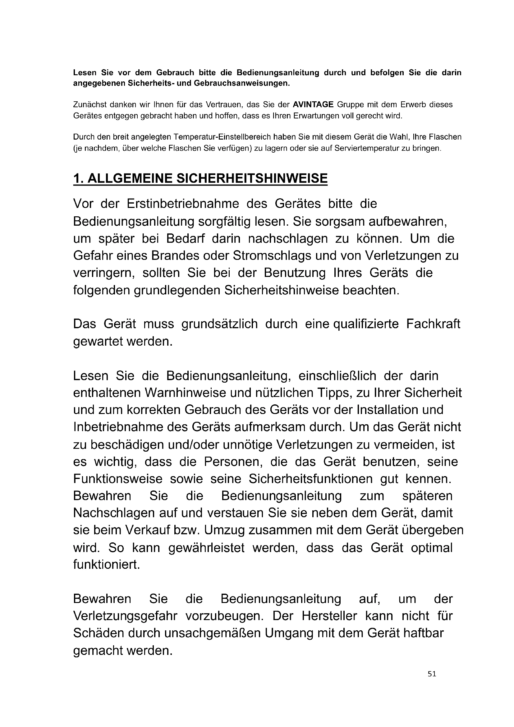 As we continuously improve our products for the benefit of our customers, we reserve the right to modify technical characteristics without notice. Warranties for AVINTAGE brand products are offered exclusively by selected retailers. No part of these instructions may be considered as a supplementary guarantee. FRIO ENTREPRISE cannot be held liable for errors or technical or editorial omissions in this document. Non-binding document.51 Lesen Sie vor dem Gebrauch bitte die Bedienungsanleitung durch und befolgen Sie die darin angegebenen Sicherheits- und Gebrauchsanweisungen. Zunächst danken wir Ihnen für das Vertrauen, das Sie der AVINTAGE Gruppe mit dem Erwerb dieses Gerätes entgegen gebracht haben und hoffen, dass es Ihren Erwartungen voll gerecht wird. Durch den breit angelegten Temperatur-Einstellbereich haben Sie mit diesem Gerät die Wahl, Ihre Flaschen (je nachdem, über welche Flaschen Sie verfügen) zu lagern oder sie auf Serviertemperatur zu bringen.