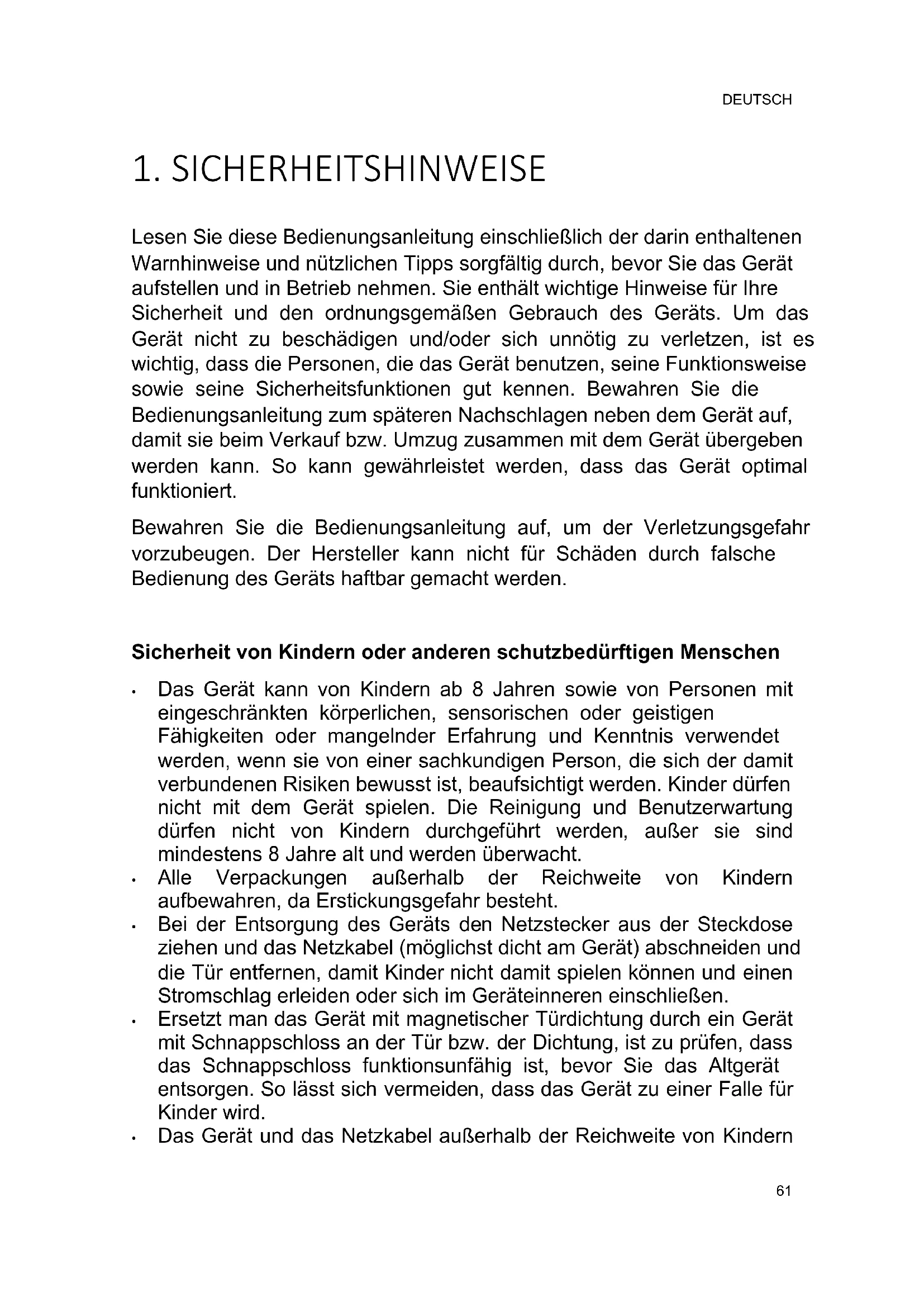Lesen Sie diese Bedienungsanleitung einschließlich der darin enthaltenen Warnhinweise und nützlichen Tipps sorgfältig durch, bevor Sie das Gerät aufstellen und in Betrieb nehmen. Sie enthält wichtige Hinweise für Ihre Sicherheit und den ordnungsgemäßen Gebrauch des Geräts. Um das Gerät nicht zu beschädigen und/oder sich unnötig zu verletzen, ist es wichtig, dass die Personen, die das Gerät benutzen, seine Funktionsweise sowie seine Sicherheitsfunktionen gut kennen. Bewahren Sie die Bedienungsanleitung zum späteren Nachschlagen neben dem Gerät auf, damit sie beim Verkauf bzw. Umzug zusammen mit dem Gerät übergeben werden kann. So kann gewährleistet werden, dass das Gerät optimal funktioniert. Bewahren Sie die Bedienungsanleitung auf, um der Verletzungsgefahr vorzubeugen. Der Hersteller kann nicht für Schäden durch falsche Bedienung des Geräts haftbar gemacht werden. Sicherheit von Kindern oder anderen schutzbedürftigen Menschen