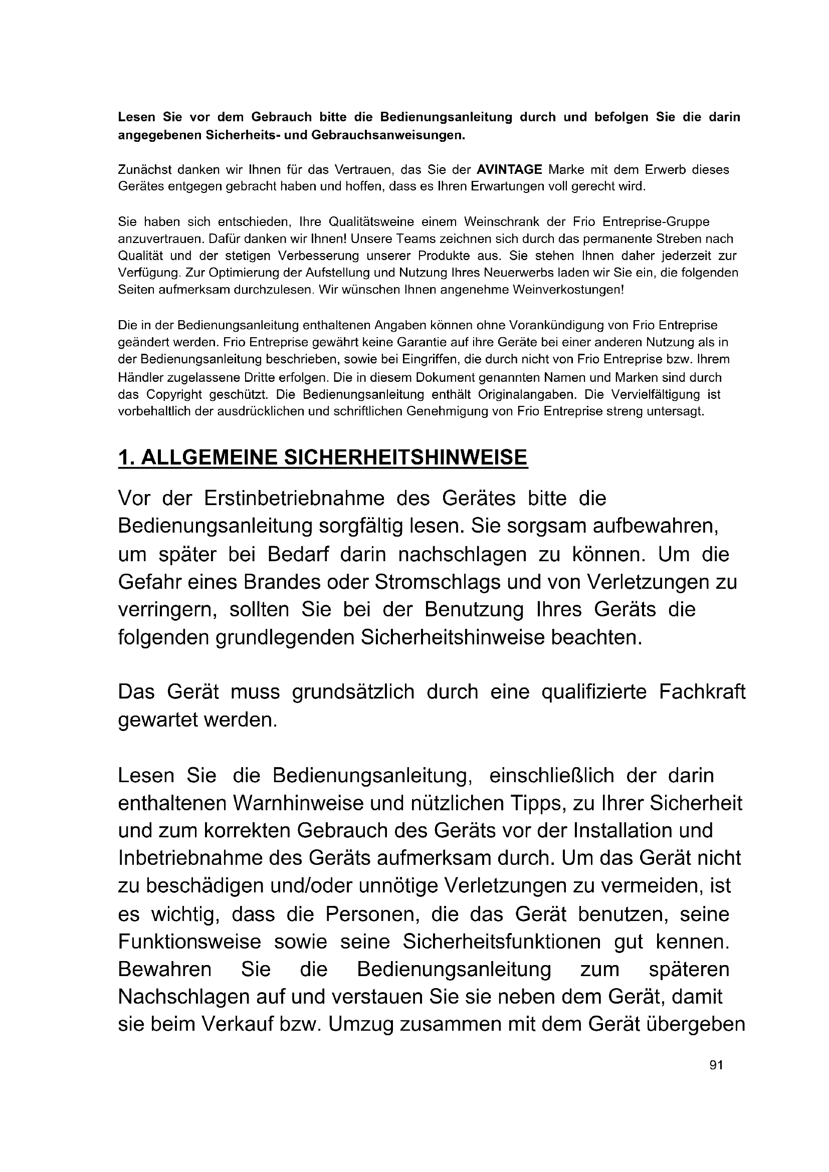 If after one hour, the parameters are not back to normal, the sound alarm will be on again. We recommend you to disconnect your appliance and call the service centre. But, whatever happens, do not panic if you observe an abnormal temperature or relative humidity value inside your wine cabinet! Only an extended and persistent exposure of your wines to these abnormal conditions might prove detrimental to them.91 Lesen Sie vor dem Gebrauch bitte die Bedienungsanleitung durch und befolgen Sie die darin angegebenen Sicherheits- und Gebrauchsanweisungen. Zunächst danken wir Ihnen für das Vertrauen, das Sie der AVINTAGE Marke mit dem Erwerb dieses Gerätes entgegen gebracht haben und hoffen, dass es Ihren Erwartungen voll gerecht wird. Sie haben sich entschieden, Ihre Qualitätsweine einem Weinschrank der Frio Entreprise-Gruppe anzuvertrauen. Dafür danken wir Ihnen! Unsere Teams zeichnen sich durch das permanente Streben nach Qualität und der stetigen Verbesserung unserer Produkte aus. Sie stehen Ihnen daher jederzeit zur Verfügung. Zur Optimierung der Aufstellung und Nutzung Ihres Neuerwerbs laden wir Sie ein, die folgenden Seiten aufmerksam durchzulesen. Wir wünschen Ihnen angenehme Weinverkostungen! Die in der Bedienungsanleitung enthaltenen Angaben können ohne Vorankündigung von Frio Entreprise geändert werden. Frio Entreprise gewährt keine Garantie auf ihre Geräte bei einer anderen Nutzung als in der Bedienungsanleitung beschrieben, sowie bei Eingriffen, die durch nicht von Frio Entreprise bzw. Ihrem Händler zugelassene Dritte erfolgen. Die in diesem Dokument genannten Namen und Marken sind durch das Copyright geschützt. Die Bedienungsanleitung enthält Originalangaben. Die Vervielfältigung ist vorbehaltlich der ausdrücklichen und schriftlichen Genehmigung von Frio Entreprise streng untersagt.