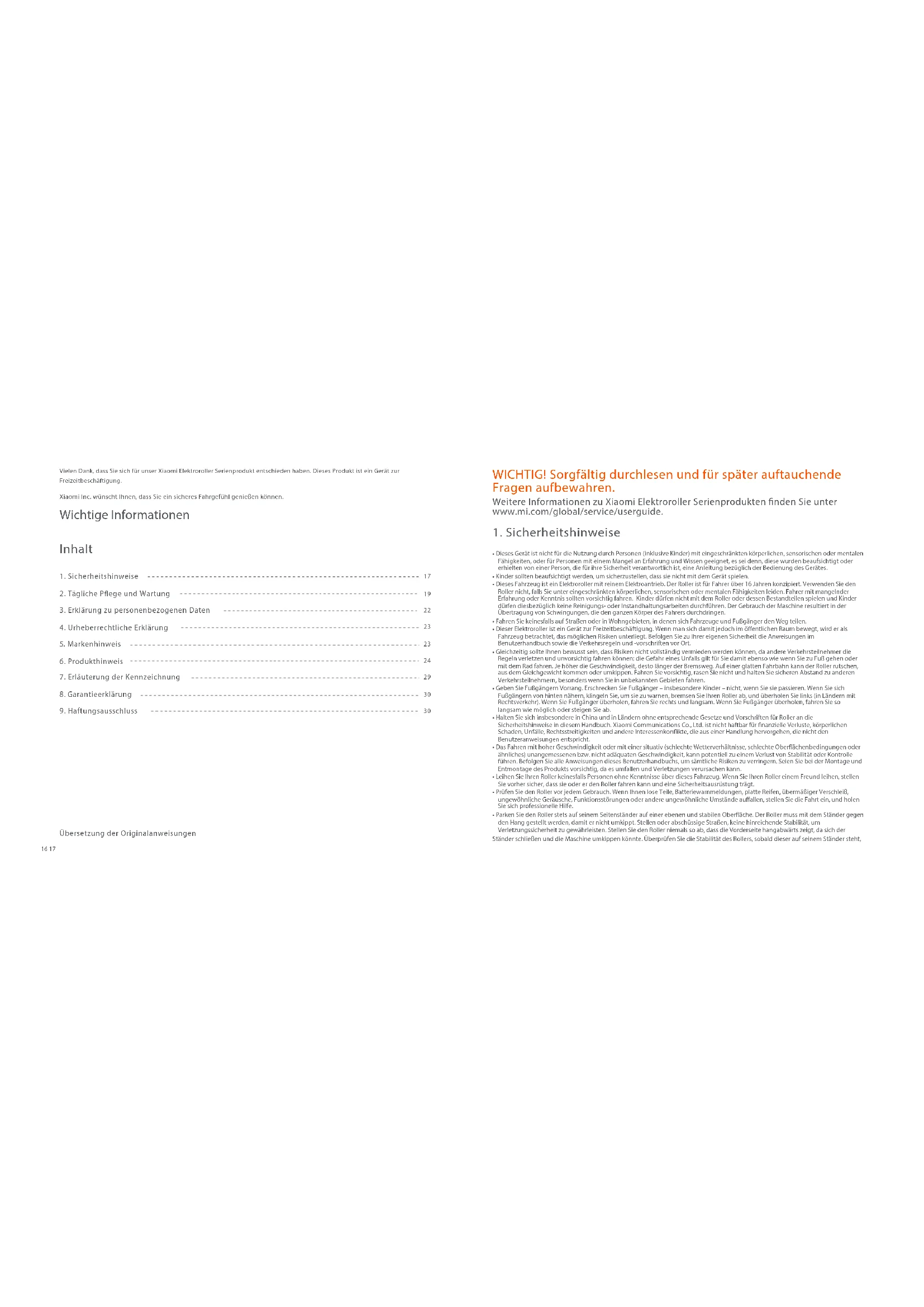 - Steigen Sie an Orten wie Zebrastreifen, an denen Fußgänger Vorrang haben, bitte ab und schieben Sie den Roller.18 19 WICHTIG! Sorgfältig durchlesen und für später auftauchende Fragen aufbewahren. Weitere Informationen zu Xiaomi Elektroroller Serienprodukten nden Sie unter www.mi.com/global/service/userguide.