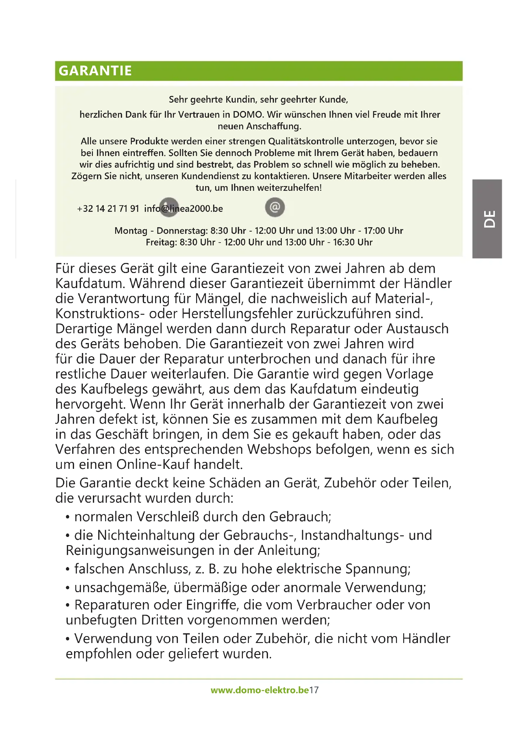 GARANTIE Sehr geehrte Kundin, sehr geehrter Kunde, herzlichen Dank für Ihr Vertrauen in DOMO. Wir wünschen Ihnen viel Freude mit Ihrer neuen Anschaung. Alle unsere Produkte werden einer strengen Qualitätskontrolle unterzogen, bevor sie bei Ihnen eintreen. Sollten Sie dennoch Probleme mit Ihrem Gerät haben, bedauern wir dies aufrichtig und sind bestrebt, das Problem so schnell wie möglich zu beheben. Zögern Sie nicht, unseren Kundendienst zu kontaktieren. Unsere Mitarbeiter werden alles tun, um Ihnen weiterzuhelfen! +32 14 21 71 91 info@linea2000.be Montag - Donnerstag: 8:30 Uhr - 12:00 Uhr und 13:00 Uhr - 17:00 Uhr Freitag: 8:30 Uhr - 12:00 Uhr und 13:00 Uhr - 16:30 Uhr Für dieses Gerät gilt eine Garantiezeit von zwei Jahren ab dem Kaufdatum. Während dieser Garantiezeit übernimmt der Händler die Verantwortung für Mängel, die nachweislich auf Material-, Konstruktions- oder Herstellungsfehler zurückzuführen sind. Derartige Mängel werden dann durch Reparatur oder Austausch des Geräts behoben. Die Garantiezeit von zwei Jahren wird für die Dauer der Reparatur unterbrochen und danach für ihre restliche Dauer weiterlaufen. Die Garantie wird gegen Vorlage des Kaufbelegs gewährt, aus dem das Kaufdatum eindeutig hervorgeht. Wenn Ihr Gerät innerhalb der Garantiezeit von zwei Jahren defekt ist, können Sie es zusammen mit dem Kaufbeleg in das Geschäft bringen, in dem Sie es gekauft haben, oder das Verfahren des entsprechenden Webshops befolgen, wenn es sich um einen Online-Kauf handelt. Die Garantie deckt keine Schäden an Gerät, Zubehör oder Teilen, die verursacht wurden durch: