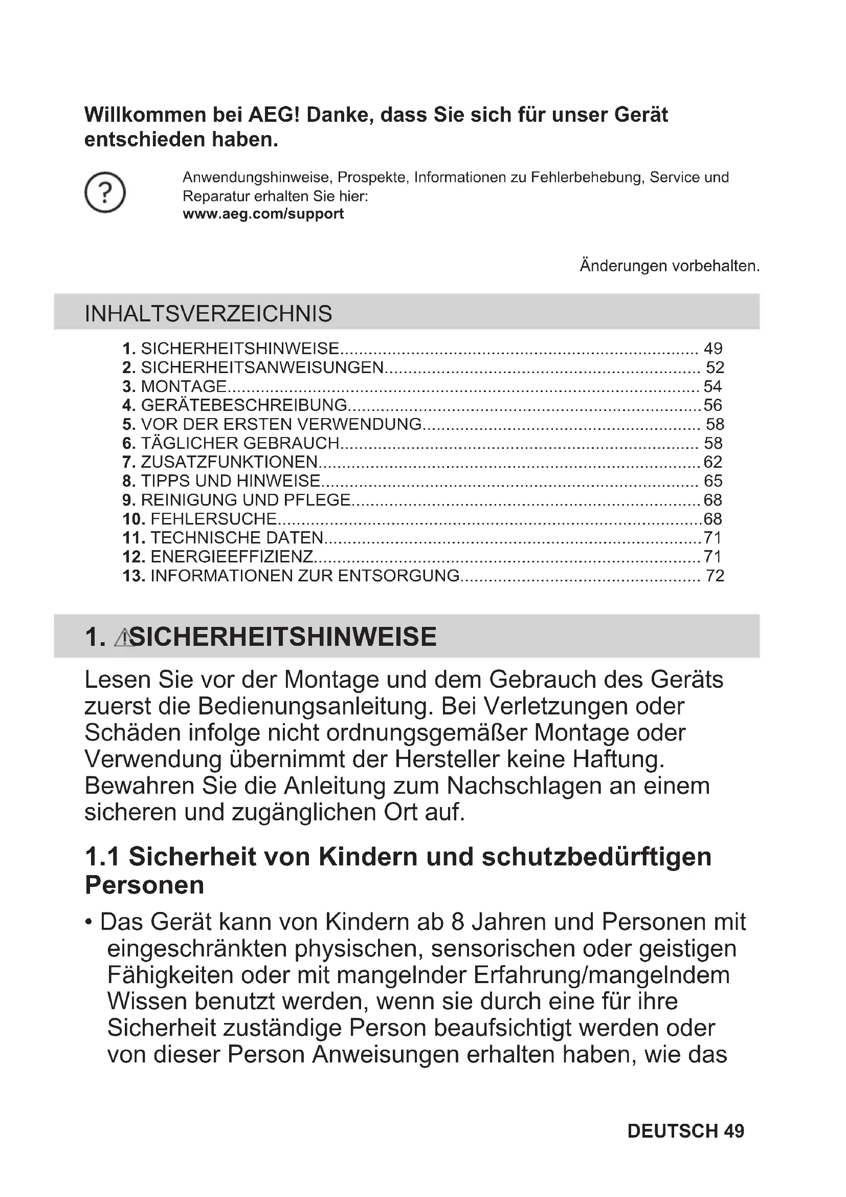 - Das Gerät kann von Kindern ab 8 Jahren und Personen mit eingeschränkten physischen, sensorischen oder geistigen Fähigkeiten oder mit mangelnder Erfahrung/mangelndem Wissen benutzt werden, wenn sie durch eine für ihre Sicherheit zuständige Person beaufsichtigt werden oder von dieser Person Anweisungen erhalten haben, wie das DEUTSCH 49Gerät sicher zu bedienen ist und welche Gefahren bei nicht ordnungsgemäßer Bedienung bestehen. Kinder unter 8 Jahren und Personen mit schweren Behinderungen oder Mehrfachbehinderung sollten vom Gerät ferngehalten werden, wenn sie nicht ständig beaufsichtigt werden.
