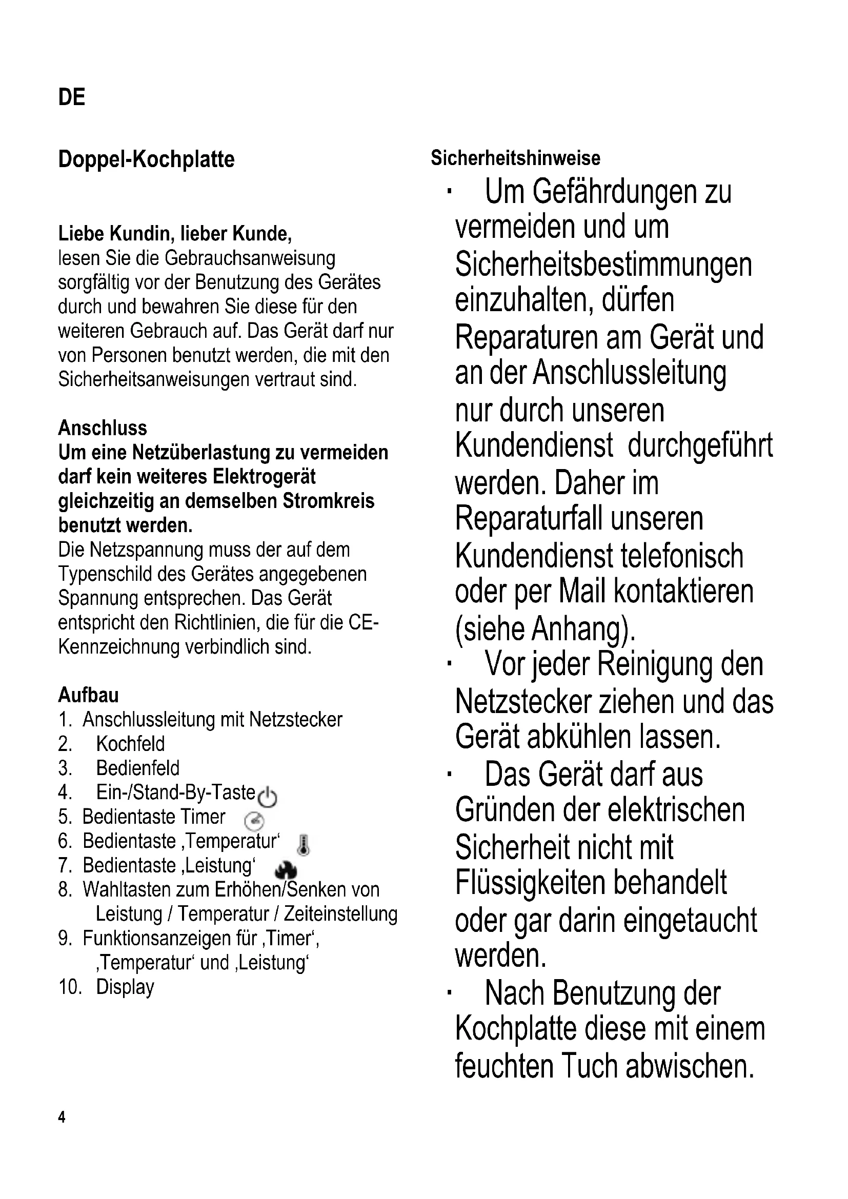 Sicherheitshinweise ∙ Um Gefährdungen zu vermeiden und um Sicherheitsbestimmungen einzuhalten, dürfen Reparaturen am Gerät und an der Anschlussleitung nur durch unseren Kundendienst durchgeführt werden. Daher im Reparaturfall unseren Kundendienst telefonisch oder per Mail kontaktieren (siehe Anhang). ∙ Vor jeder Reinigung den Netzstecker ziehen und das Gerät abkühlen lassen. ∙ Das Gerät darf aus Gründen der elektrischen Sicherheit nicht mit Flüssigkeiten behandelt oder gar darin eingetaucht werden. ∙ Nach Benutzung der Kochplatte diese mit einem feuchten Tuch abwischen. DE104 x 142 mm