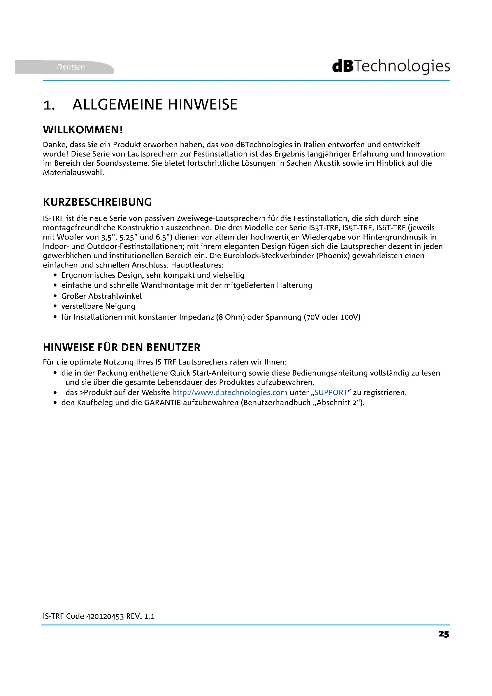 WILLKOMMEN! Danke, dass Sie ein Produkt erworben haben, das von dBTechnologies in Italien entworfen und entwickelt wurde! Diese Serie von Lautsprechern zur Festinstallation ist das Ergebnis langjähriger Erfahrung und Innovation im Bereich der Soundsysteme. Sie bietet fortschrittliche Lösungen in Sachen Akustik sowie im Hinblick auf die Materialauswahl. KURZBESCHREIBUNG IS-TRF ist die neue Serie von passiven Zweiwege-Lautsprechern für die Festinstallation, die sich durch eine montagefreundliche Konstruktion auszeichnen. Die drei Modelle der Serie IS3T-TRF, IS5T-TRF, IS6T-TRF (jeweils mit Woofer von 3,5”, 5.25” und 6.5”) dienen vor allem der hochwertigen Wiedergabe von Hintergrundmusik in Indoor- und Outdoor-Festinstallationen; mit ihrem eleganten Design fügen sich die Lautsprecher dezent in jeden gewerblichen und institutionellen Bereich ein. Die Euroblock-Steckverbinder (Phoenix) gewährleisten einen einfachen und schnellen Anschluss. Hauptfeatures: