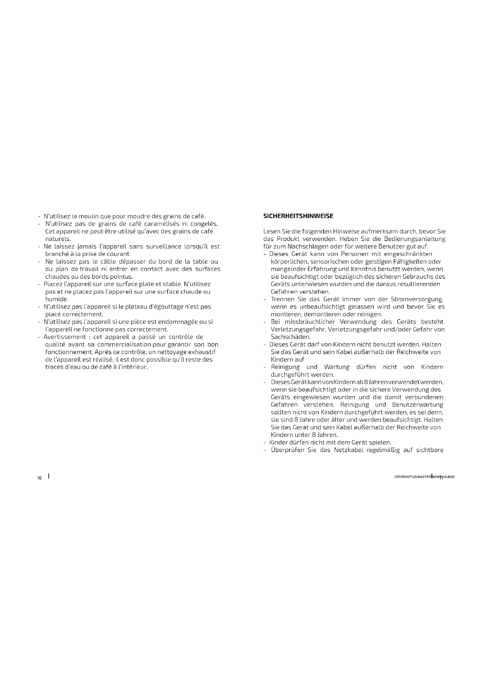 - N’utilisez le moulin que pour moudre des grains de café. - N’utilisez pas de grains de café caramélisés ni congelés. Cet appareil ne peut être utilisé qu’avec des grains de café naturels. - Ne laissez jamais l’appareil sans surveillance lorsqu’il est branché à la prise de courant. - Ne laissez pas le câble dépasser du bord de la table ou du plan de travail ni entrer en contact avec des surfaces chaudes ou des bords pointus. - Placez l’appareil sur une surface plate et stable. N’utilisez pas et ne placez pas l’appareil sur une surface chaude ou humide. - N’utilisez pas l’appareil si le plateau d’égouttage n’est pas placé correctement. - N’utilisez pas l’appareil si une pièce est endommagée ou si l’appareil ne fonctionne pas correctement. - Avertissement : cet appareil a passé un contrôle de qualité avant sa commercialisation pour garantir son bon fonctionnement. Après ce contrôle, un nettoyage exhaustif de l’appareil est réalisé, il est donc possible qu’il reste des traces d’eau ou de café à l’intérieur. SICHERHEITSHINWEISE Lesen Sie die folgenden Hinweise aufmerksam durch, bevor Sie das Produkt verwenden. Heben Sie die Bedienungsanleitung für zum Nachschlagen oder für weitere Benutzer gut auf. - Dieses Gerät kann von Personen mit eingeschränkten körperlichen, sensorischen oder geistigen Fähigkeiten oder mangelnder Erfahrung und Kenntnis benutzt werden, wenn sie beaufsichtigt oder bezüglich des sicheren Gebrauchs des Geräts unterwiesen wurden und die daraus resultierenden Gefahren verstehen. - Trennen Sie das Gerät immer von der Stromversorgung, wenn es unbeaufsichtigt gelassen wird und bevor Sie es montieren, demontieren oder reinigen. - Bei missbräuchlicher Verwendung des Geräts besteht Verletzungsgefahr, Verletzungsgefahr und/oder Gefahr von Sachschäden. - Dieses Gerät darf von Kindern nicht benutzt werden. Halten Sie das Gerät und sein Kabel außerhalb der Reichweite von Kindern auf - Reinigung und Wartung dürfen nicht von Kindern durchgeführt werden. - Dieses Gerät kann von Kindern ab 8 Jahren verwendet werden, wenn sie beaufsichtigt oder in die sichere Verwendung des Geräts eingewiesen wurden und die damit verbundenen Gefahren verstehen. Reinigung und Benutzerwartung sollten nicht von Kindern durchgeführt werden, es sei denn, sie sind 8 Jahre oder älter und werden beaufsichtigt. Halten Sie das Gerät und sein Kabel außerhalb der Reichweite von Kindern unter 8 Jahren. - Kinder dürfen nicht mit dem Gerät spielen. - Überprüfen Sie das Netzkabel regelmäßig auf sichtbareCREMMAET LOUNGECREMMAET LOUNGE