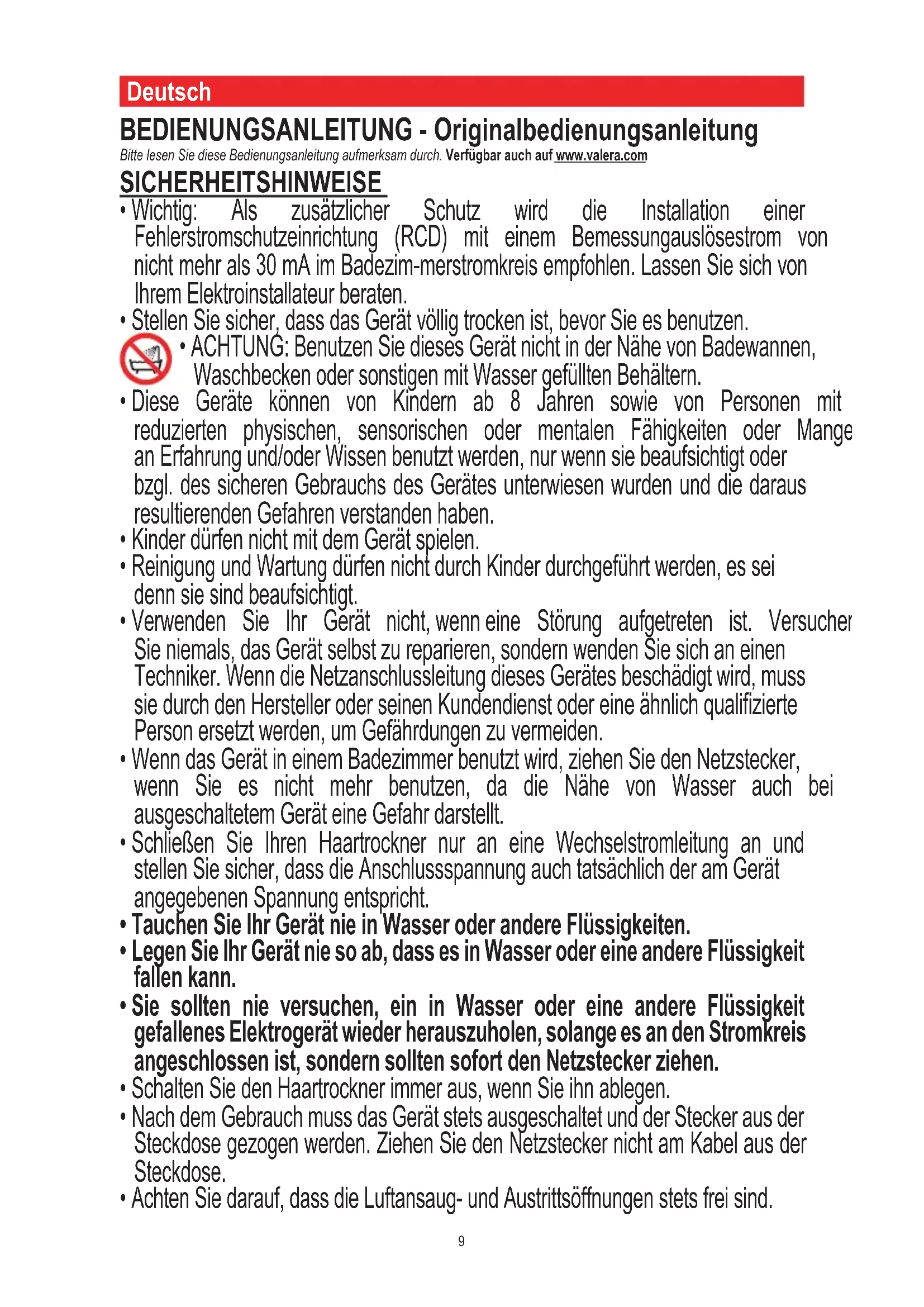 VALERA is a registered trade mark of LIGO PATENTS SA - SwitzerlandDeutsch BEDIENUNGSANLEITUNG - Originalbedienungsanleitung Bitte lesen Sie diese Bedienungsanleitung aufmerksam durch. Verfügbar auch auf www.valera.com SICHERHEITSHINWEISE