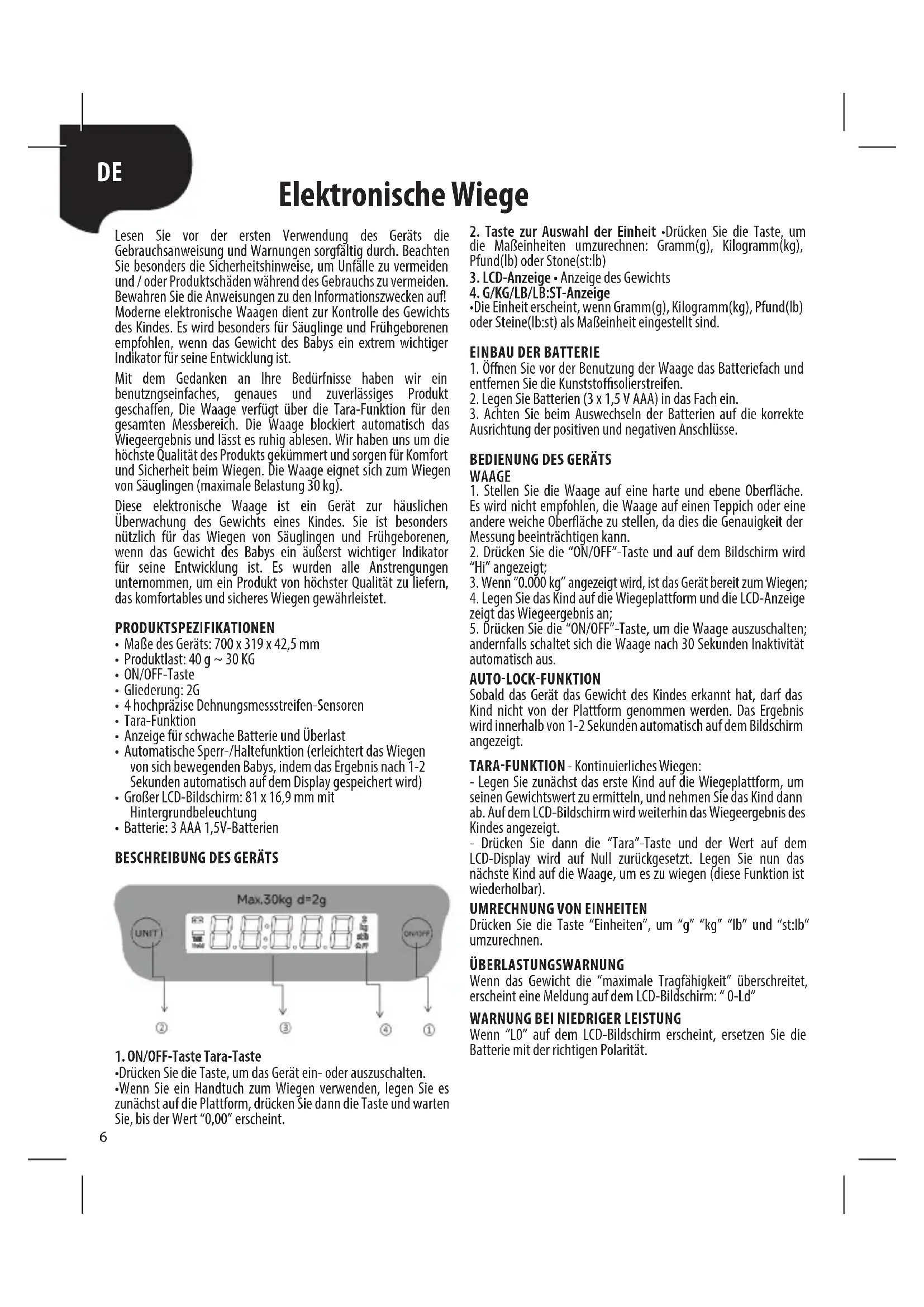- Optimální provozní a skladovací teplota váhy je 5-30 °C.6 Lesen Sie vor der ersten Verwendung des Geräts die Gebrauchsanweisung und Warnungen sorgfältig durch. Beachten Sie besonders die Sicherheitshinweise, um Unfälle zu vermeiden und / oder Produktschäden während des Gebrauchs zu vermeiden. Bewahren Sie die Anweisungen zu den Informationszwecken auf! Moderne elektronische Waagen dient zur Kontrolle des Gewichts des Kindes. Es wird besonders für Säuglinge und Frühgeborenen empfohlen, wenn das Gewicht des Babys ein extrem wichtiger Indikator für seine Entwicklung ist. Mit dem Gedanken an Ihre Bedürfnisse haben wir ein benutzngseinfaches, genaues und zuverlässiges Produkt geschaen, Die Waage verfügt über die Tara-Funktion für den gesamten Messbereich. Die Waage blockiert automatisch das Wiegeergebnis und lässt es ruhig ablesen. Wir haben uns um die höchste Qualität des Produkts gekümmert und sorgen für Komfort und Sicherheit beim Wiegen. Die Waage eignet sich zum Wiegen von Säuglingen (maximale Belastung 30 kg). Diese elektronische Waage ist ein Gerät zur häuslichen Überwachung des Gewichts eines Kindes. Sie ist besonders nützlich für das Wiegen von Säuglingen und Frühgeborenen, wenn das Gewicht des Babys ein äußerst wichtiger Indikator für seine Entwicklung ist. Es wurden alle Anstrengungen unternommen, um ein Produkt von höchster Qualität zu liefern, das komfortables und sicheres Wiegen gewährleistet. PRODUKTSPEZIFIKATIONEN
