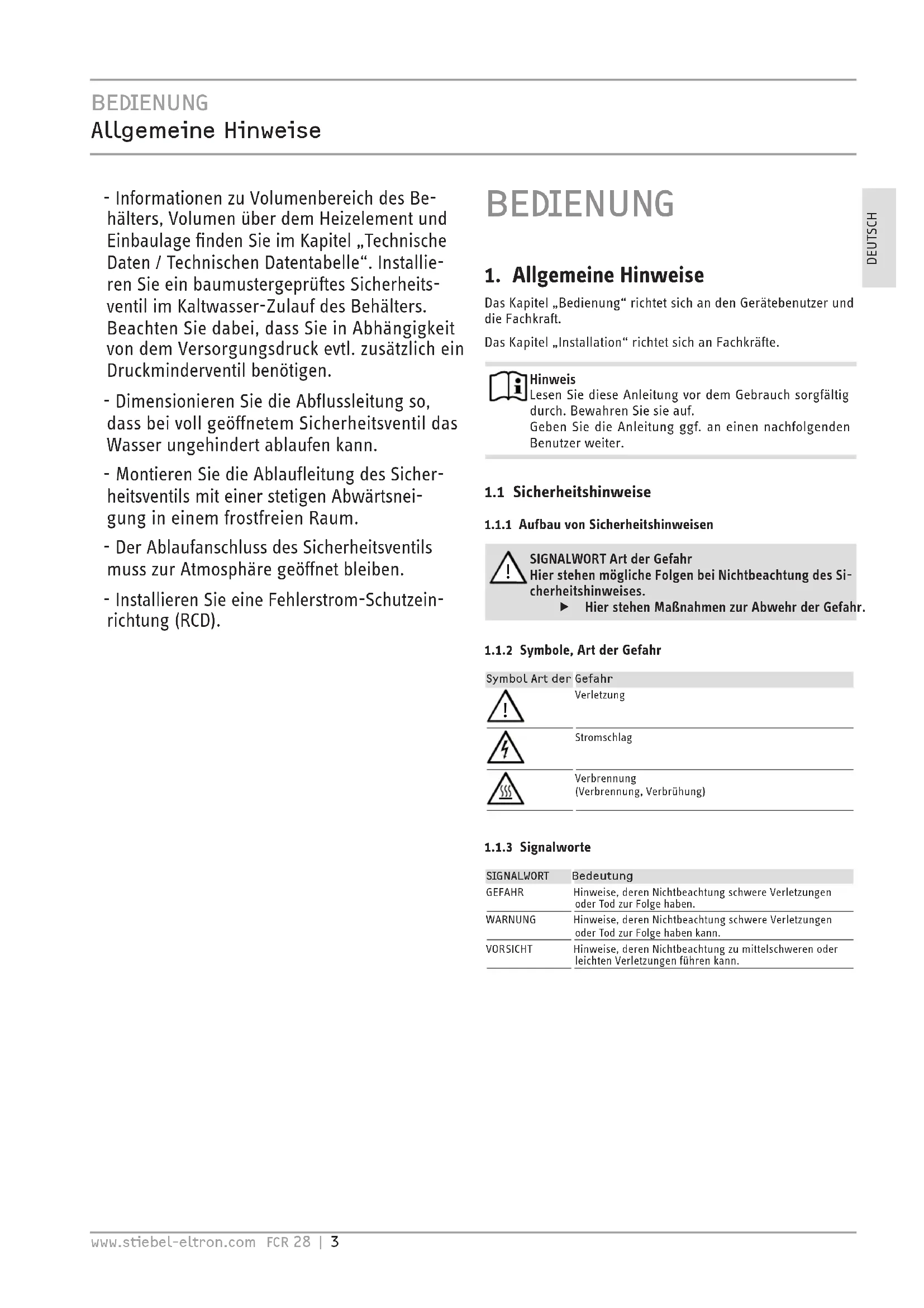 Verbrennung(Verbrennung, Verbrühung) 1.1.3 SignalworteSIGNALWORT Bedeutung GEFAHR Hinweise, deren Nichtbeachtung schwere Verletzungen oder Tod zur Folge haben.WARNUNG Hinweise, deren Nichtbeachtung schwere Verletzungen oder Tod zur Folge haben kann. VORSICHT Hinweise, deren Nichtbeachtung zu mittelschweren oder leichten Verletzungen führen kann. !BEDIENUNG Sicherheit 4 | FCR 28 www.stiebel-eltron.com