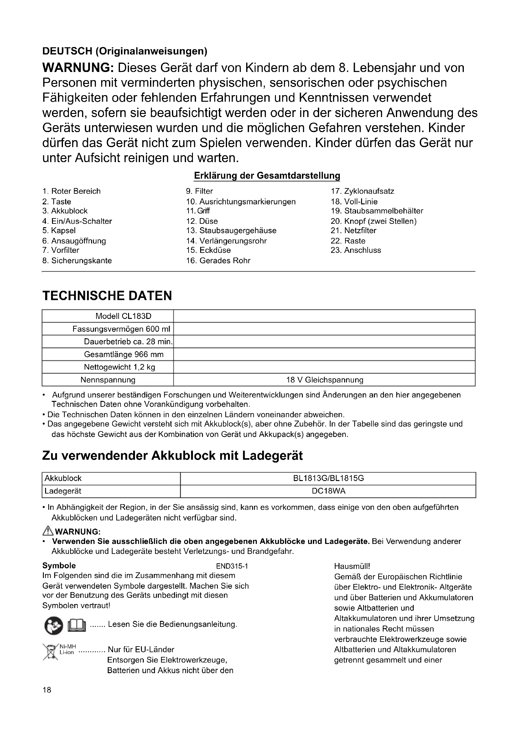 Modell CL183D Fassungsvermögen 600 ml Dauerbetrieb ca. 28 min. Gesamtlänge 966 mm Nettogewicht 1,2 kg Nennspannung 18 V Gleichspannung Akkublock BL1813G/BL1815G Ladegerät DC18WA Ni-MHLi-ion19 umweltgerechten Wiederverwertung zugeführt werden. Verwendungszweck ENE017-1 Dieses Gerät wurde für das Aufsaugen von Staub entwickelt.