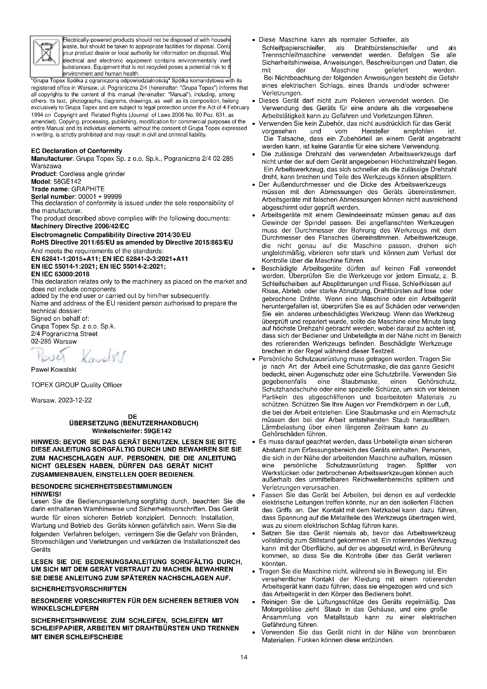 Elektrisch betriebene Produkte dürfen nicht mit dem Hausmüll entsorgt werden, sondern müssen einer geeigneten Einrichtung zur Entsorgung zugeführt werden. Wenden Sie sich an Ihren Händler oder die örtlichen Behörden, um Informationen zur Entsorgung zu erhalten. Elektro- und Elektronik-Altgeräte enthalten umweltverträgliche Stoffe. Geräte, die nicht recycelt werden, stellen eine potenzielle Gefahr für die Umwelt und die menschliche Gesundheit dar. "Grupa Topex Spółka z ograniczoną odpowiedzialnością". Spółka komandytowa mit Sitz in Warschau, ul. Pograniczna 2/4 (im Folgenden: "Grupa Topex") teilt mit, dass alle Urheberrechte am Inhalt dieses Handbuchs (im Folgenden: "Handbuch"), einschließlich, unter anderem. Der Text, die Fotografien, die Diagramme, die Zeichnungen sowie die Zusammensetzung des Handbuchs gehören ausschließlich der Grupa Topex und unterliegen dem rechtlichen Schutz gemäß dem Gesetz vom 4. Februar 1994 über das Urheberrecht und verwandte Rechte (Gesetzblatt 2006 Nr. 90 Poz. 631, in der geänderten Fassung). Das Kopieren, Verarbeiten, Veröffentlichen, Verändern des gesamten Handbuchs und seiner einzelnen Elemente zu kommerziellen Zwecken ist ohne schriftliche Zustimmung von Grupa Topex strengstens verboten und kann zivil- und strafrechtliche Folgen haben. EG-Konformitätserklärung Hersteller: Grupa Topex Sp. z o.o. Sp.k., Pograniczna 2/4 02-285 Warszawa Produkt: Schnurloser Winkelschleifer Modell: 58GE142 Handelsname: GRAPHITE Seriennummer: 00001 ÷ 99999 Diese Konformitätserklärung wird unter der alleinigen Verantwortung des Herstellers ausgestellt. Das oben beschriebene Produkt entspricht den folgenden Dokumenten: Maschinenrichtlinie 2006/42/EG Richtlinie 2014/30/EU über die elektromagnetische Verträglichkeit RoHS-Richtlinie 2011/65/EU, geändert durch Richtlinie 2015/863/EU Und erfüllt die Anforderungen der Normen: EN 62841-1:2015+A11; EN IEC 62841-2-3:2021+A11 EN IEC 55014-1:2021; EN IEC 55014-2:2021; EN IEC 63000:2018 Diese Erklärung bezieht sich nur auf die Maschine in der Form, in der sie in Verkehr gebracht wird, und umfasst keine Bauteile vom Endnutzer hinzugefügt oder von ihm nachträglich durchgeführt werden. Name und Anschrift der in der EU ansässigen Person, die zur Erstellung des technischen Dossiers befugt ist: Unterzeichnet im Namen von: Grupa Topex Sp. z o.o. Sp.k. 2/4 Pograniczna Straße 02-285 Warschau Paweł Kowalski TOPEX GROUP Qualitätsbeauftragter Warschau, 2023-12-22