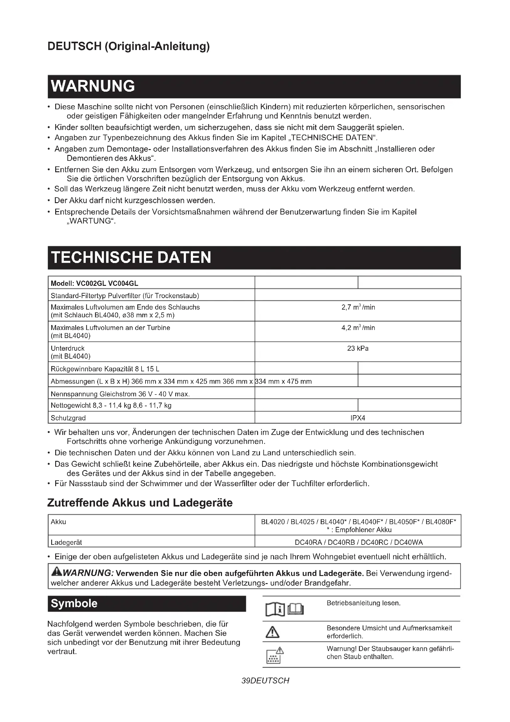 - Einige der oben aufgelisteten Akkus und Ladegeräte sind je nach Ihrem Wohngebiet eventuell nicht erhältlich. WARNUNG: Verwenden Sie nur die oben aufgeführten Akkus und Ladegeräte. Bei Verwendung irgend- welcher anderer Akkus und Ladegeräte besteht Verletzungs- und/oder Brandgefahr. Symbole Nachfolgend werden Symbole beschrieben, die für das Gerät verwendet werden können. Machen Sie sich unbedingt vor der Benutzung mit ihrer Bedeutung vertraut. Betriebsanleitung lesen. Besondere Umsicht und Aufmerksamkeit erforderlich. Warnung! Der Staubsauger kann gefährli- chen Staub enthalten.40 DEUTSCH Stellen Sie sich niemals auf den Staubsauger. Staubklasse L (leicht). Die Staubsauger sind in der Lage, Staub der Staubklasse L aufzusaugen. Befolgen Sie die Vorschriften Ihres Landes in Bezug auf Stäube sowie Sicherheit und Gesundheitsschutz am Arbeitsplatz. Ni-MH Li-ion Nur für EU-Länder Aufgrund des Vorhandenseins gefähr- licher Komponenten in der Ausrüstung können Elektro- und Elektronik-Altgeräte, Akkumulatoren und Batterien sich nega- tiv auf die Umwelt und die menschliche Gesundheit auswirken. Entsorgen Sie Elektro- und Elektronikgeräte oder Batterien nicht mit dem Hausmüll! In Übereinstimmung mit der Europäischen Richtlinie über Elektro- und Elektronik- Altgeräte, Akkumulatoren und Batterien, verbrauchte Akkumulatoren und Batterien sowie ihrer Anpassung an nati- onales Recht sollten Elektro-Altgeräte, Batterien und Akkumulatoren gemäß den Umweltschutzbestimmungen getrennt gelagert und zu einer getrennten Sammelstelle für Siedlungsabfälle geliefert werden. Dies wird durch das am Gerät angebrachte Symbol der durchgestrichenen Abfalltonne auf Rädern angezeigt. Vorgesehene Verwendung Das Gerät ist für das Absaugen von Trockenstaub vorgesehen. Das Gerät eignet sich für kommerziellen Einsatz, z. B. in Hotels, Schulen, Krankenhäusern, Fabriken, Läden, Büros und Mietunternehmen. Geräusch Typischer A-bewerteter Geräuschpegel ermittelt gemäß EN60335-2-69: Modell VC002GL Schalldruckpegel (L
