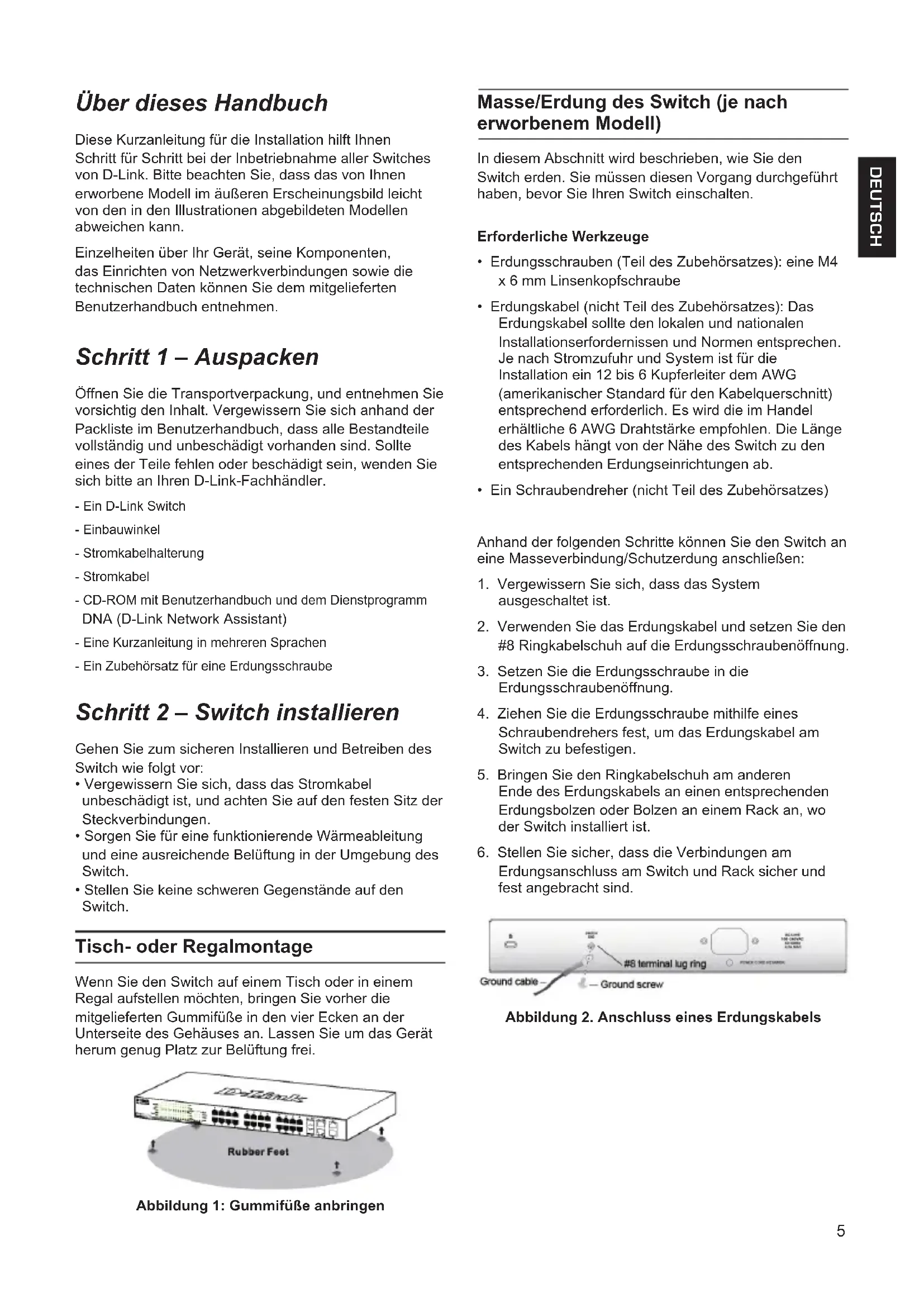 segment of your PC and use the DNA (D-Link Network Assistant) to discover the Switch. For detailed information of DNA, please refer the user manual. Telnet Management (depending on the purchased model) Users may also access the switch through Telnet using your PC’s Command Prompt. To access it from your computer, users must rst ensure that a valid connection is made through the Ethernet port of the Switch and your PC, and then click Start > Programs > Accessories > Command Prompt on your computer. Once the console window opens, enter the command telnet 10.90.90.90 (depending on congured IP address) and press Enter on your keyboard. You should be directed to the opening console screen for the Command Line Interface of the switch, enter the “admin” for the default user name and password for the Switch and press the Enter key. SNMP-Based Management (depending on the purchased model) You can manage the Switch with D-Link D-View or any SNMP-compatible program. The SNMP function is default Disabled. Additional Information If you are encountering problems setting up your network, please refer to the user manual that came with the switch. It contains many more rules, charts, explanations, and examples to help you get your network up and running. Additional help is available through our ofces listed at the back of the user manual or online. To nd out more about D-Link products or marketing information, please visit the website http://www.dlink.com. Warranty Information The D-Link Limited Lifetime Warranty information is available at http://warranty.dlink.com/5 DEUTSCH Über dieses Handbuch Diese Kurzanleitung für die Installation hilft Ihnen Schritt für Schritt bei der Inbetriebnahme aller Switches von D-Link. Bitte beachten Sie, dass das von Ihnen erworbene Modell im äußeren Erscheinungsbild leicht von den in den Illustrationen abgebildeten Modellen abweichen kann. Einzelheiten über Ihr Gerät, seine Komponenten, das Einrichten von Netzwerkverbindungen sowie die technischen Daten können Sie dem mitgelieferten Benutzerhandbuch entnehmen. Schritt 1 – Auspacken Öffnen Sie die Transportverpackung, und entnehmen Sie vorsichtig den Inhalt. Vergewissern Sie sich anhand der Packliste im Benutzerhandbuch, dass alle Bestandteile vollständig und unbeschädigt vorhanden sind. Sollte eines der Teile fehlen oder beschädigt sein, wenden Sie sich bitte an Ihren D-Link-Fachhändler. - Ein D-Link Switch- Einbauwinkel- Stromkabelhalterung- Stromkabel- CD-ROM mit Benutzerhandbuch und dem Dienstprogramm DNA (D-Link Network Assistant)- Eine Kurzanleitung in mehreren Sprachen- Ein Zubehörsatz für eine Erdungsschraube Schritt 2 – Switch installieren Gehen Sie zum sicheren Installieren und Betreiben des Switch wie folgt vor: