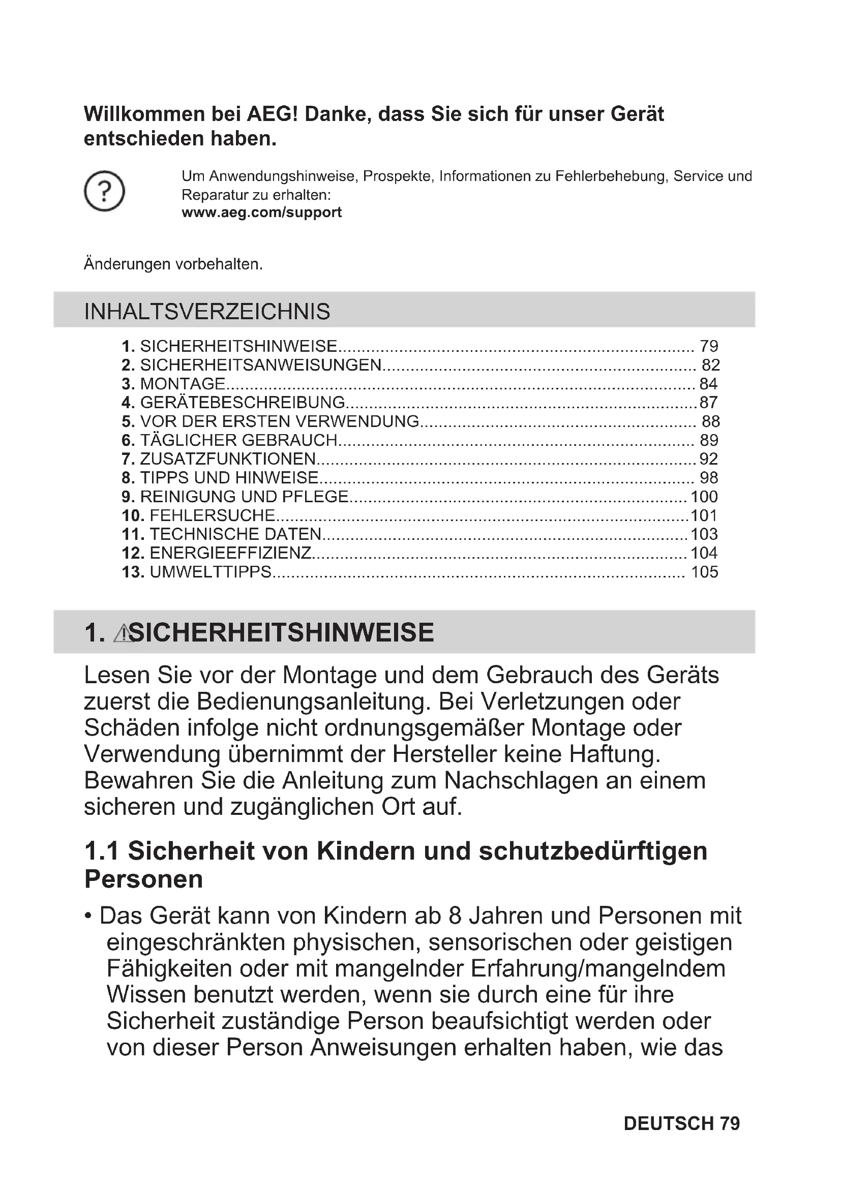 - Das Gerät kann von Kindern ab 8 Jahren und Personen mit eingeschränkten physischen, sensorischen oder geistigen Fähigkeiten oder mit mangelnder Erfahrung/mangelndem Wissen benutzt werden, wenn sie durch eine für ihre Sicherheit zuständige Person beaufsichtigt werden oder von dieser Person Anweisungen erhalten haben, wie das DEUTSCH 79Gerät sicher zu bedienen ist und welche Gefahren bei nicht ordnungsgemäßer Bedienung bestehen. Kinder unter 8 Jahren und Personen mit schweren Behinderungen oder Mehrfachbehinderung sollten vom Gerät ferngehalten werden, wenn sie nicht ständig beaufsichtigt werden.
