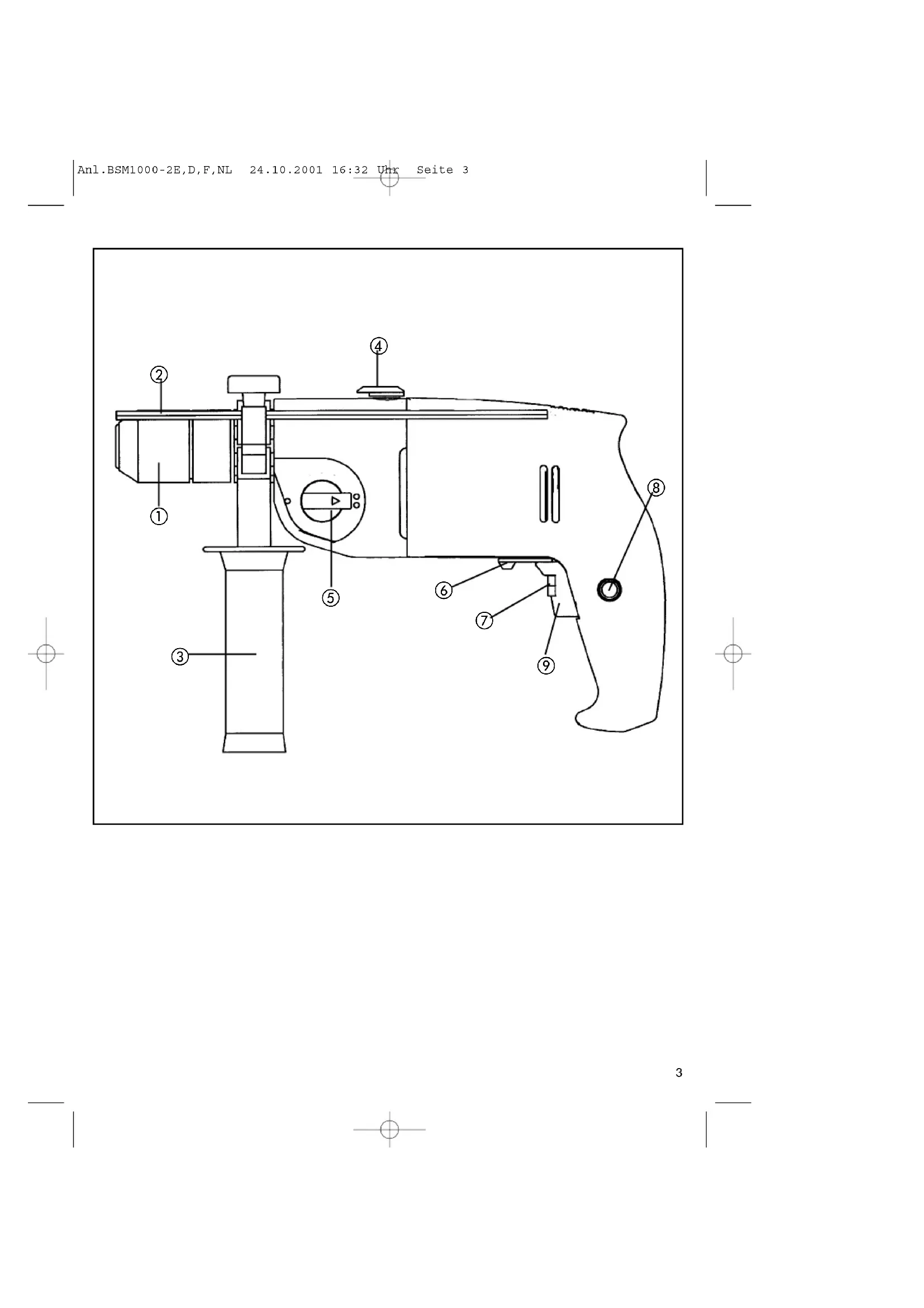 Maschine nicht überlasten. Sichern Sie alle zu bearbeitenden Werkstücke ausreichend. Kindern unzugänglich machen! Achten Sie auf einen sicheren Stand auf Leitern oder Gerüsten bei freihändigem Bohren. In Wänden, wo Strom, Wasser oder Gasleitungen unsichtbar verlegt sind, zuerst die Leitungen mit einem Leitungssuchgerät lokalisieren. Tragen Sie eine Schutzbrille und verwenden sie eine Staubmaske bei stauberzeugenden Arbeiten. Reparaturen dürfen nur vom Elektrofachmann durchgeführt werden. Verwenden Sie nur original Ersatzteile Die Lärmentwicklung am Arbeitsplatz kann 85 dB(A) überschreiten. In diesem Fall sind Schall- schutzmaßnahmen für den Bedienenden erforderlich. Das Geräusch dieses Elektrowerkzeuges wurde nach ISO 3744, NFS 31-031 (84/537/EWG) gemessen. Der Wert der ausgesendeten Schwingungen wurde nach ISO 8662-8 ermittelt. Wartung Halten Sie Ihre Bohrmaschine immer sauber. Benutzen Sie zur Reinigung des Kunststoffes keine ätzenden Mittel. Bei übermäßiger Funkenbildung überprüfen Sie die Kohlenbürsten. Halten Sie die Lüftungsschlitze frei. Sollten Sie Beschädigungen feststellen, können Sie anhand der beiliegenden Explosionszeich- nung, sowie der Teil-liste, Ersatzteile genau defi- nieren und bei unserem Kundenservice anfordern. Anl.BSM1000-2E,D,F,NL 24.10.2001 16:32 Uhr Seite 45