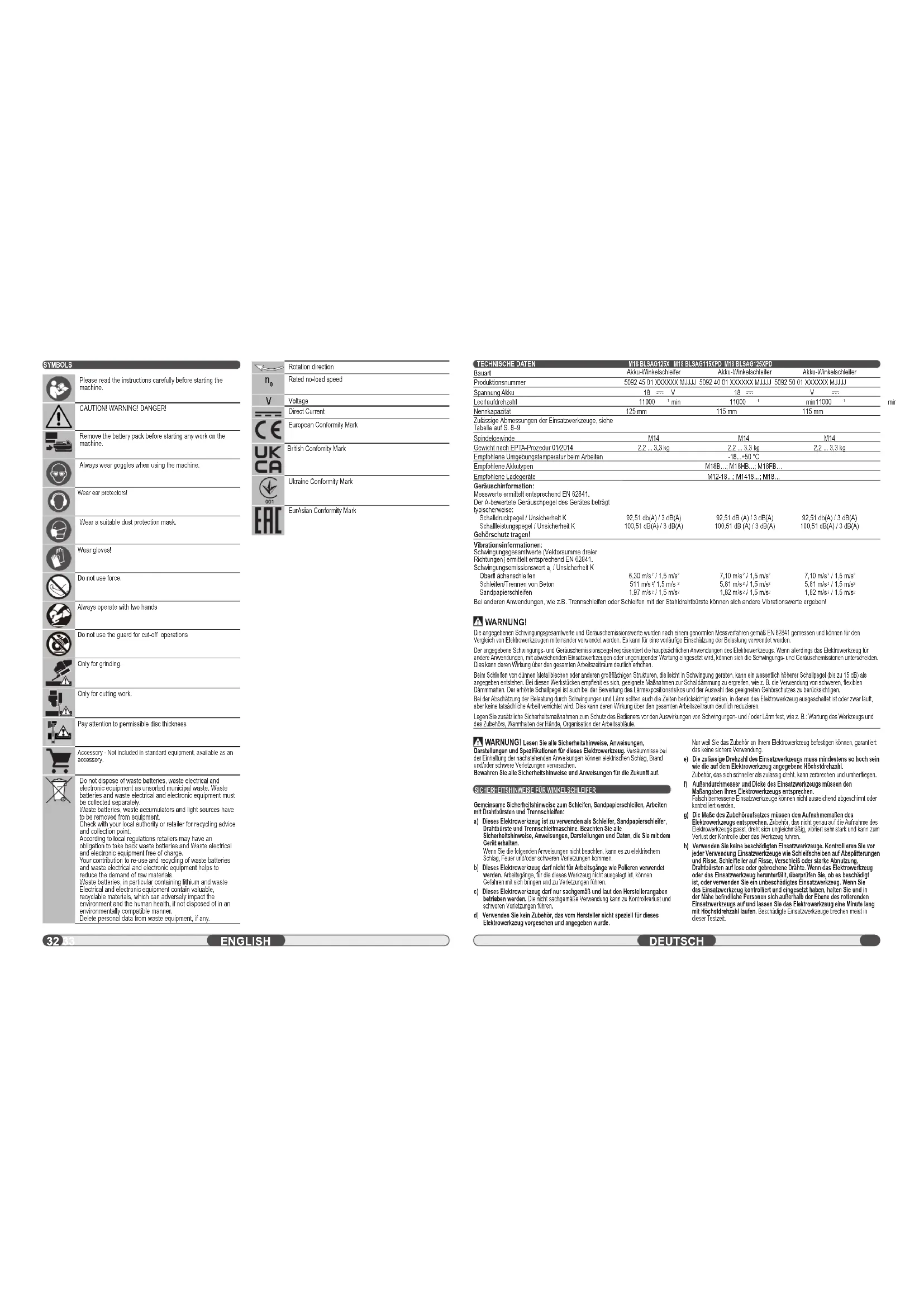 Spannung Gleichstrom Europäisches Konformitätszeichen Britisches Konformitätszeichen Ukrainisches Konformitätszeichen EurAsian Konformitätszeichen.38 39 M18 BLSAG125X M18 BLSAG115XPD M18 BLSAG125XPD